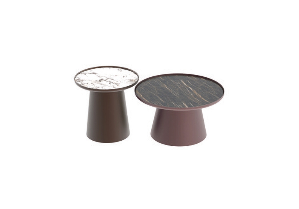 Ring designed by Riflessi is a coffee table with base in bronze painted aluminum and top in aluminum or ceramic. Available in different dimensions.