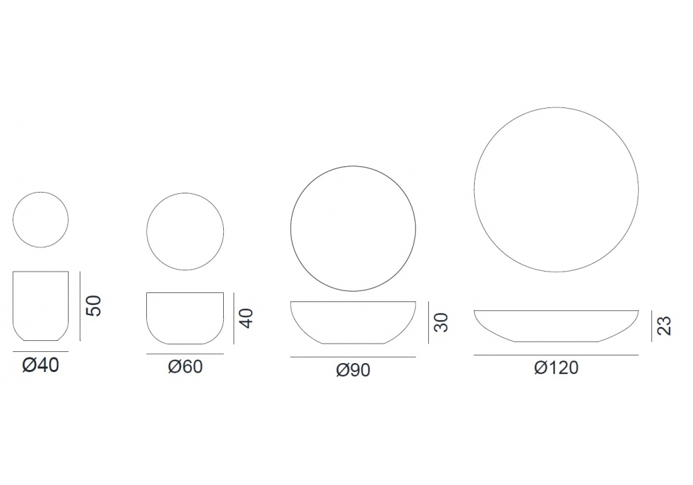 | Dimensions | Ø 40 x H 50 cm; Ø 60 x H 40 cm; Ø 90 x H 30 cm; Ø 120 x H 23 cm. |