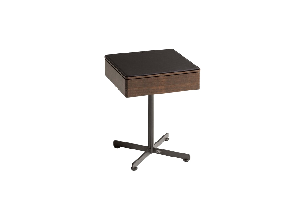 Bob designed by Jean-Marie Massaud for Poltrona Frau is a small table with drawer, ideal as a bedside table. The table is composed with moka stained solid ash top and structure; leg and cross-shaped supporting base of steel. Available with top cover mat in Pelle Frau® leather and drawer mat in beige Alcantara®.
