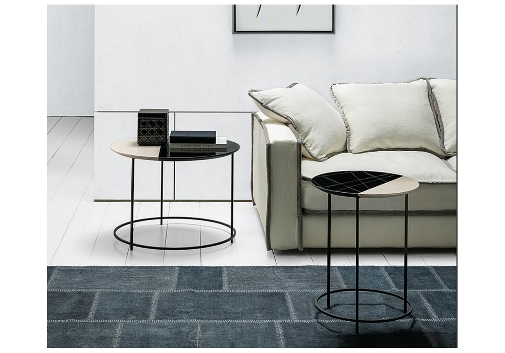 Twist designed by Laboratorio Avallone for Casamilano is a side table with MDF top with bas-relief graphics, in two-tone glossy lacquered finish. The base is in matt black painted metal.