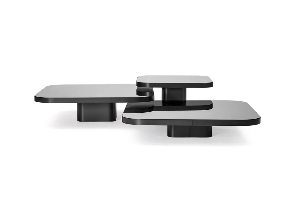 Bow Black designed by Guilherme Torres for ClassiCon is a coffee table made of solid black lacquered steel sheet, top in black lacquered glass or marble. Available in different finishes and sizes.