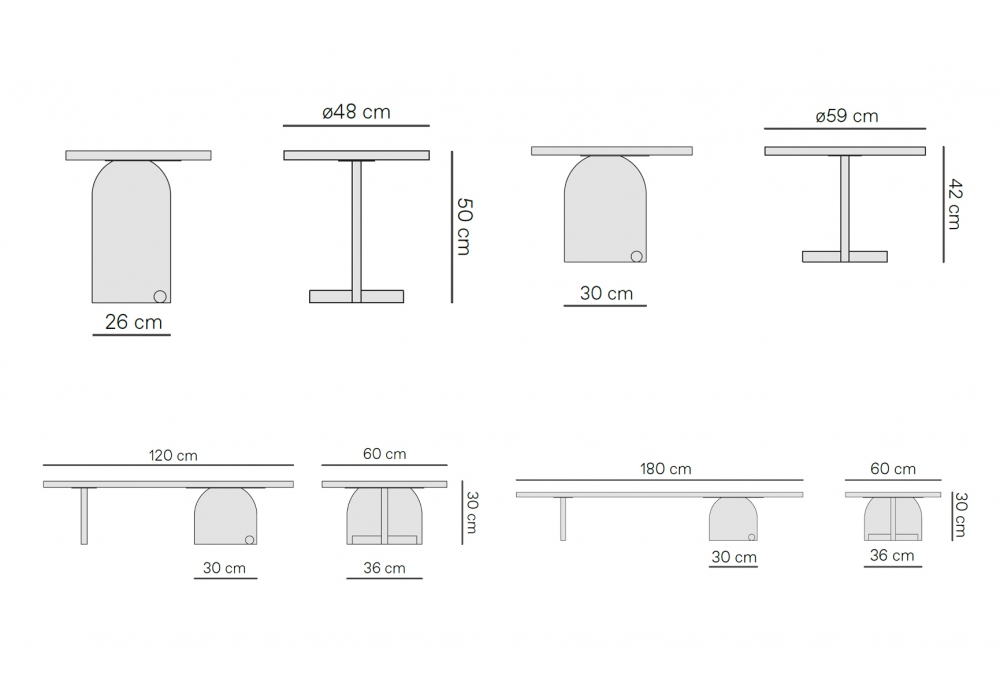 | Dimensions | Ø 48 x H 50 cm; Ø 59 x H 42 cm; 120 x 60 x H 30 cm; 180 x 60 x H 30 cm. |