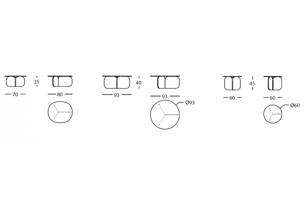 | Dimensions | • 80 x 70 x H 35 cm; • Ø 93 x H 40 cm; • Ø 60 x H 45 cm |