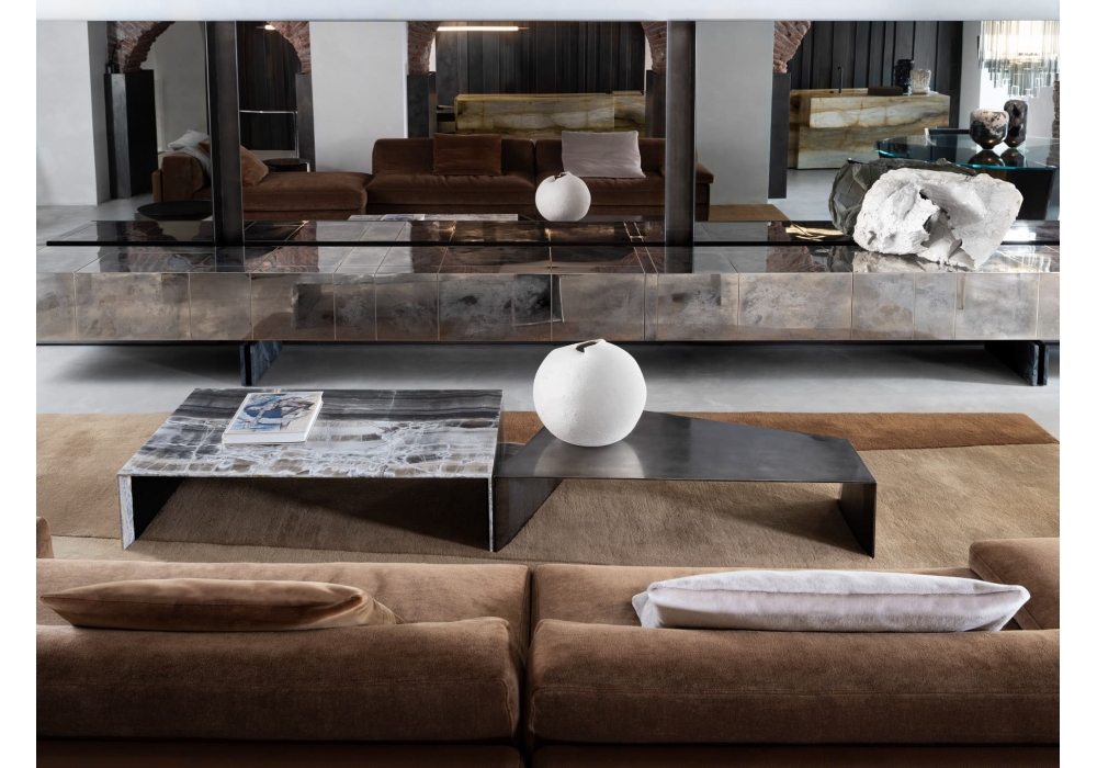 Origami designed by Ugo Cacciatori for Henge is an handmade coffee table composed by two modules in two different type of finishes: stone and metal. Available in different sizes.