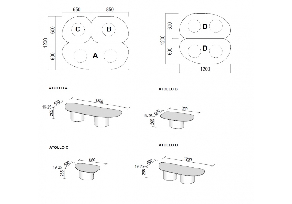 | Dimensions | A_ 150 x 60 x H 28.4/29 cm; B_ 85 x 60 x H 28.4/29 cm; C_ 65 x 60 x H 28.4/29 cm; D_ 120 x 60 x H 28.4/29 cm; A-B-C_ 150 x 120 x H 28.4/29 cm; D-D_ 120 x 120 x H 28.4/29 cm; |