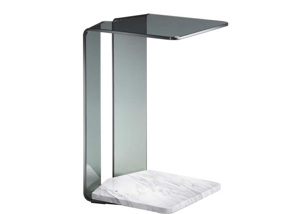 York designed by Yonoh Studio for Fiam is a side table with a curved glass structure available in the extralight, bronze or smoked variants. Marble base in various finishes.