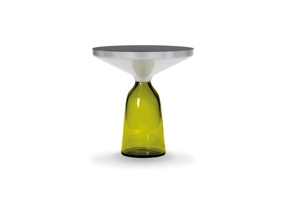 Bell Silver designed by Sebastian Herkner for ClassiCon is a side table made with a blown glass base, a solid silver metal top structure and a black lacquered glass top.
