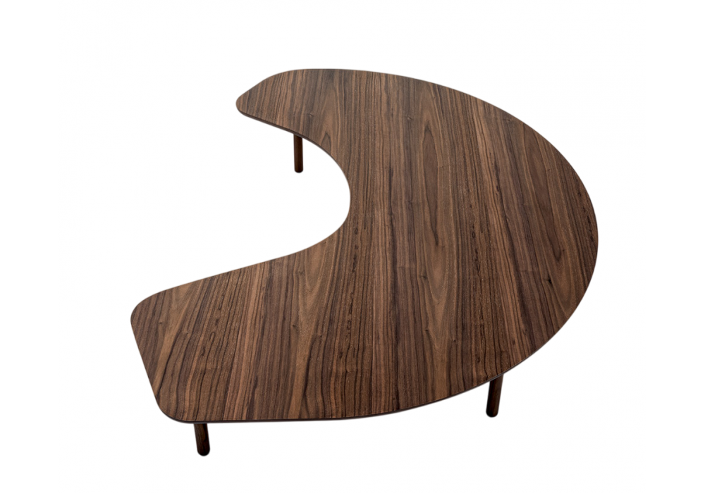 Half Moon designed by Greta Magnusson Grossman for Paola Lenti is a coffee table with a base in solid natural walnut with plastic tips. The top is made of wood fiber with a shaped edge in solid wood in the same color as the base.