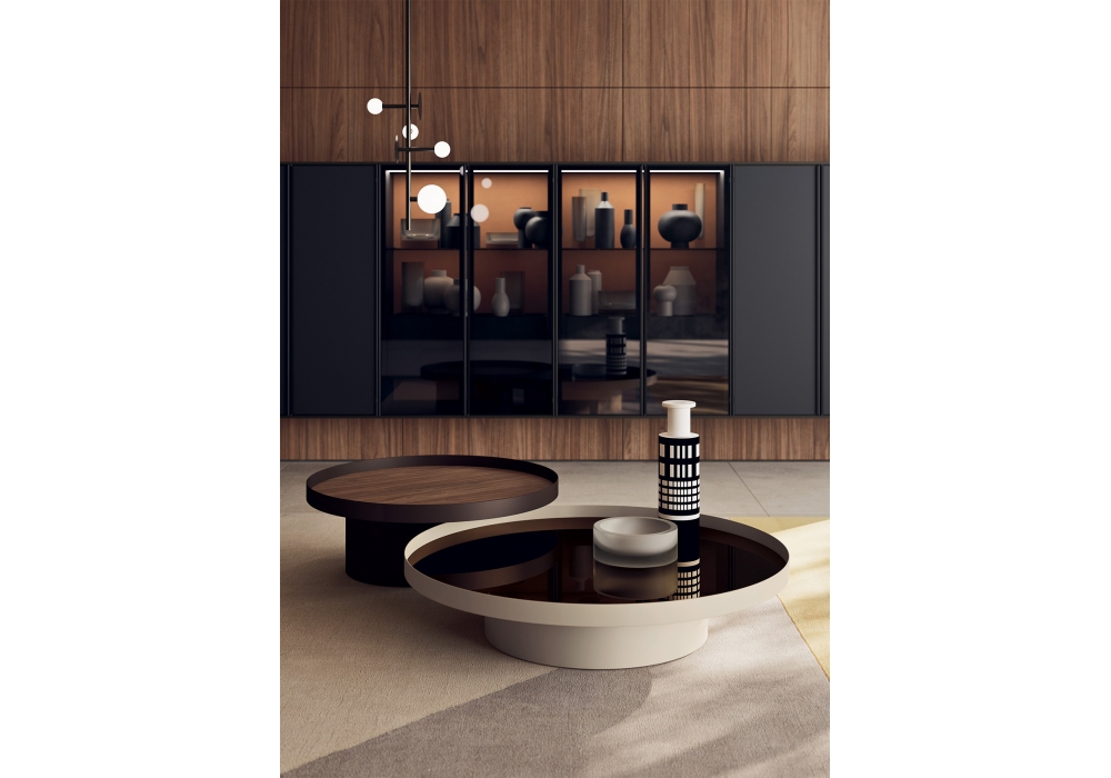 Ninfea designed by Kico is a coffee table with a cylindrical metal frame and a stoneware, glass, wood, or mirror top. Available in different finishes and dimensions.