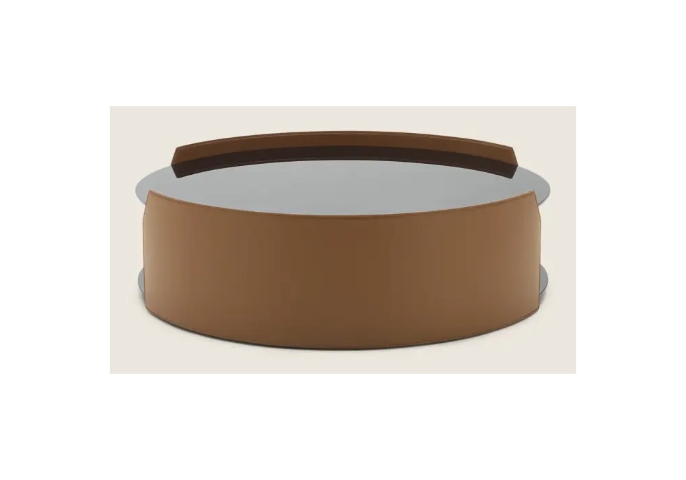 Louise designed by Patrick Norguet for Flexform is an occasional table with structure in metal clad in cowhide in different colours. Shelf in back-painted glass, available in different finishes. Rests on tips made of thermoplastic material. Available in two sizes.
