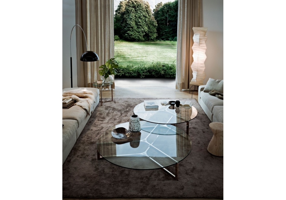 Raj 1 designed by Ricardo Bello Dias for Gallotti&Radice is a coffee table with 12mm transparent tempered glass top. Bright stainless steel base (40x20x2mm). Chromed aluminium central part. Also available with tempered smoked “grigio Italia” glass top and burnished metal structure.