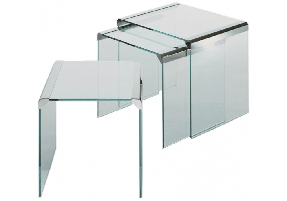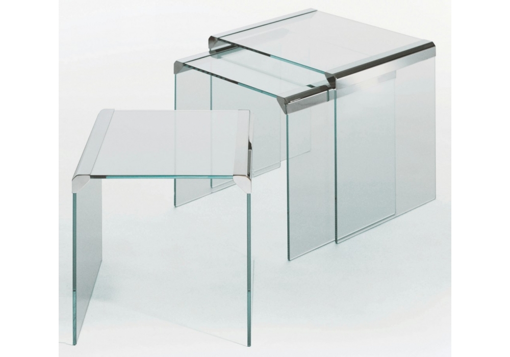 T 35 Trio designed by Pierangelo Gallotti for Gallotti&Radice is a set of three coffee tables in 8mm transparent tempered glass. Also available in smoked “grigio Italia” tempered glass. Bright stainless steel metal parts. Satin stainless steel, bright, satin brass or embossed white or black lacquered metal parts on request.