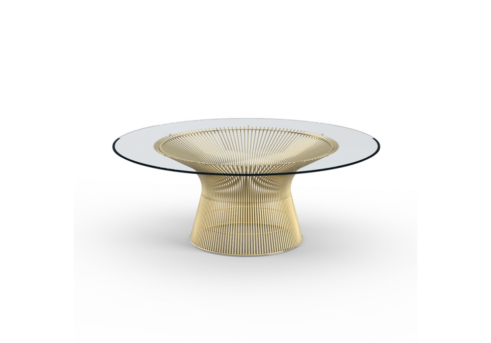 Platner designed by Warren Platner for Knoll is a large coffee table with a structure made of metal rods shaped vertically and horizontally, with nickel plating and transparent protective finish, bronze or 18k gold. Top in glass with beveled edges or marble in various finishes.