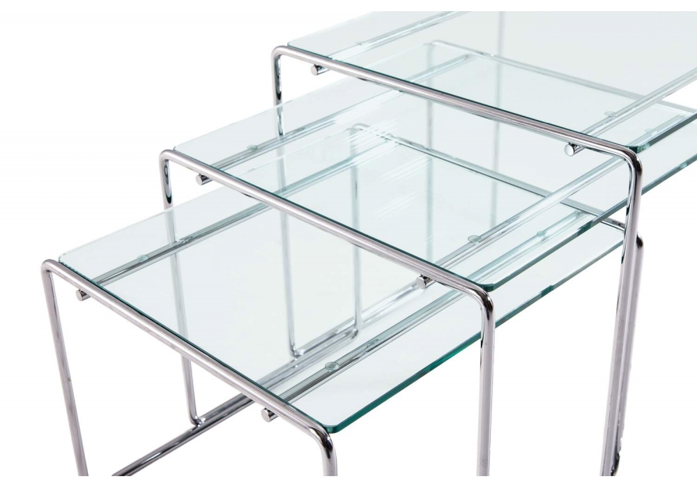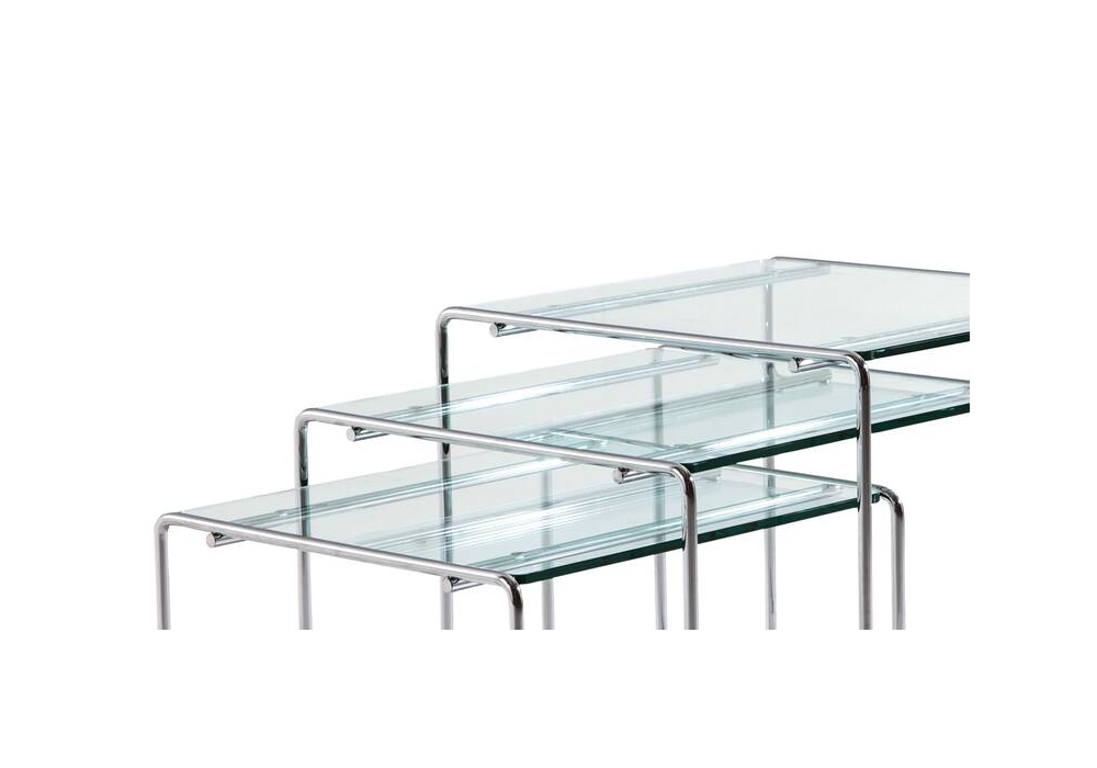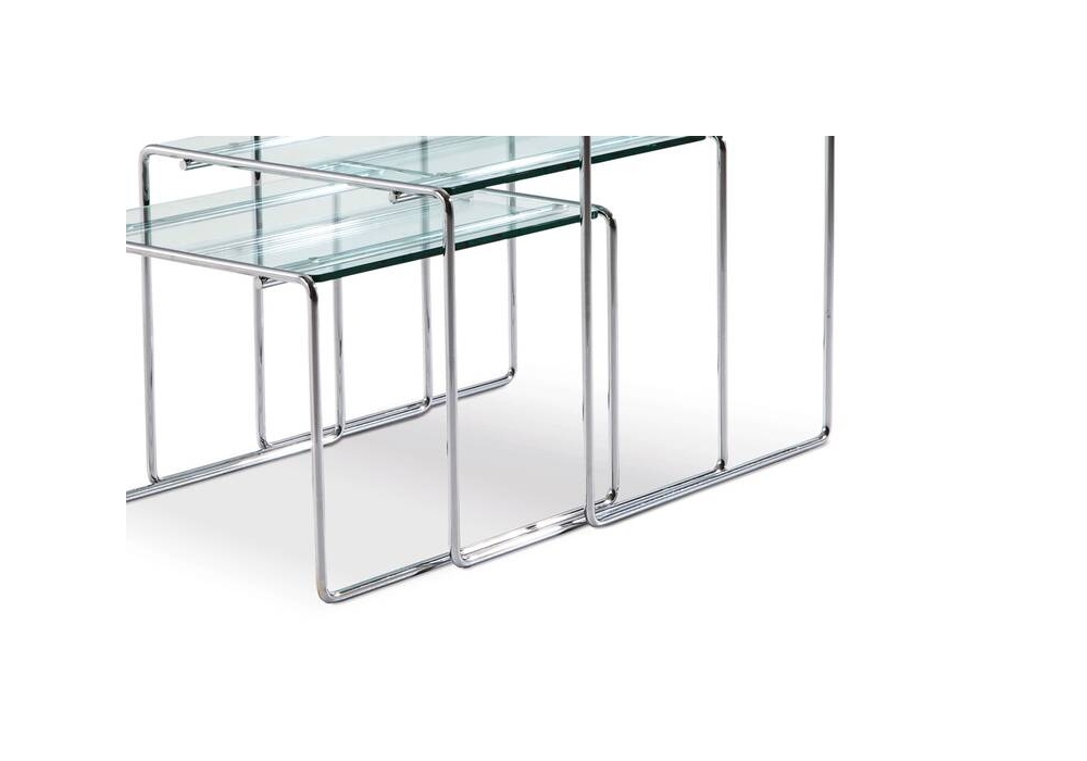 Marcel T designed by Kazuhide Takahama for Cassina is a set of three coffee tables with a float or lacquered glass top, beveled edges, and rounded corners. The frame is made of bent chrome-plated metal rod.