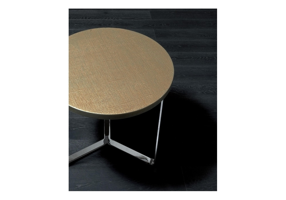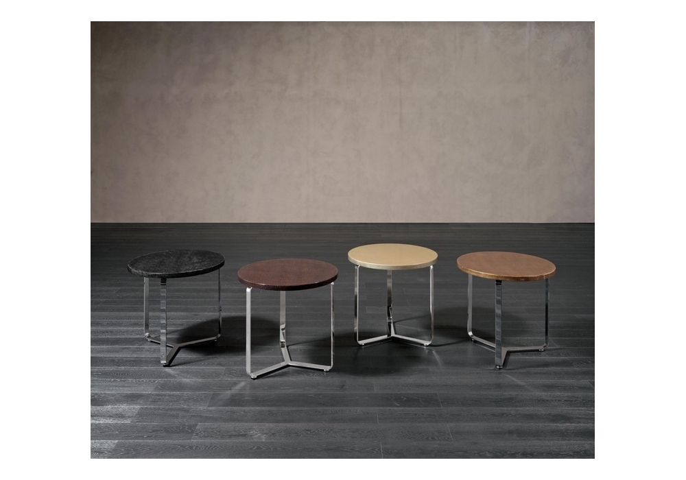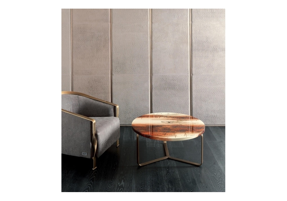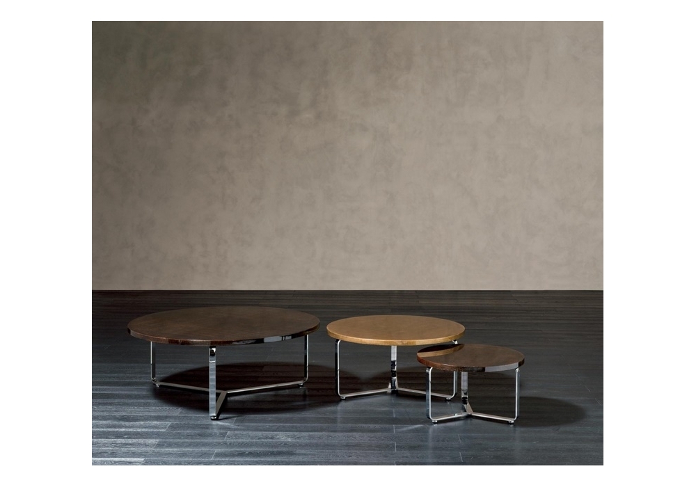 Egidio designed by Rugiano is a coffee table with top made with special colours, in leather or marble and feet in bronze or chrome steel. Available in various sizes.