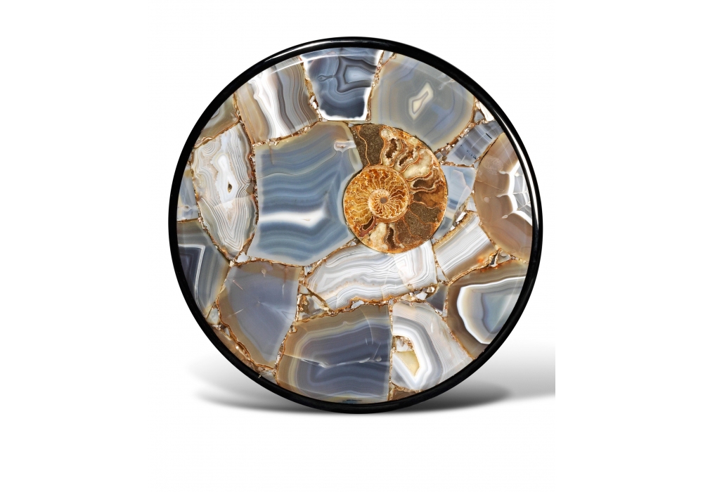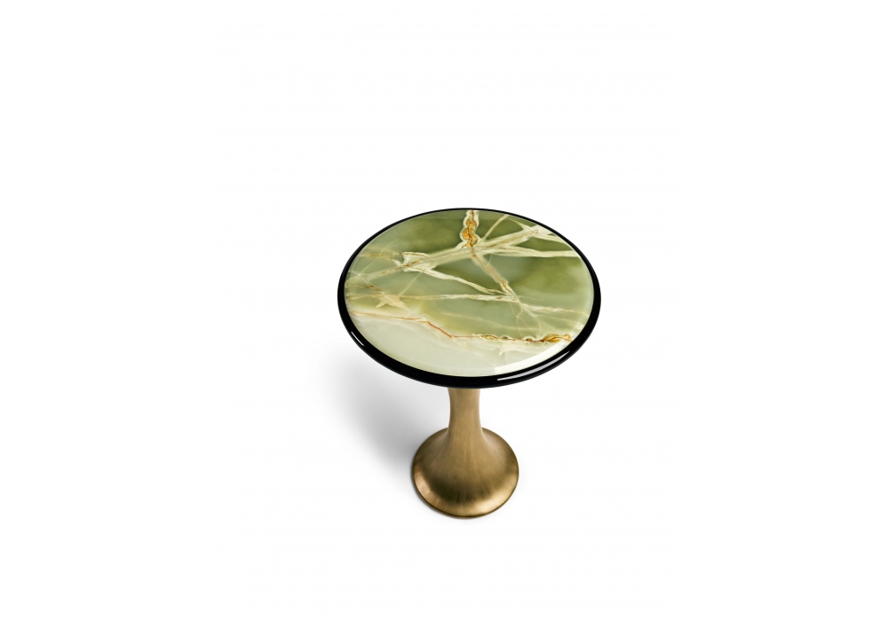 Kenaz designed by Steve Leug for Visionnaire is a coffee table with a circular top in marble or stone with a lacquered wood top underneath. The collar that supports the top is in painted metal with a cylindrical shape. The base is a single body in satin aluminum shaped in the shape of a snail. Kenaz is available in different tops and finishes.