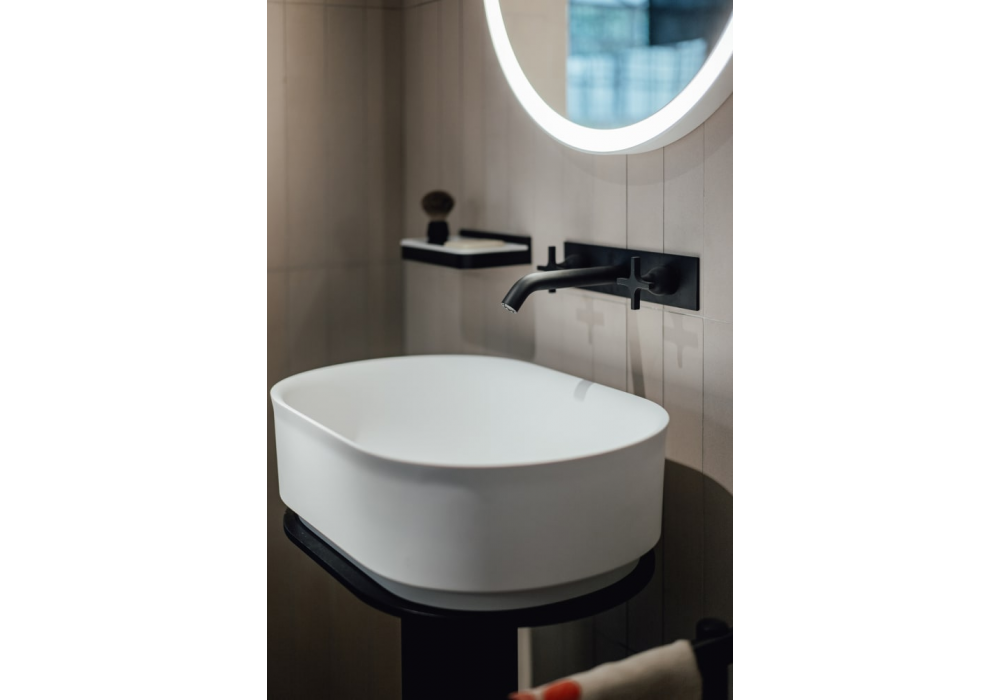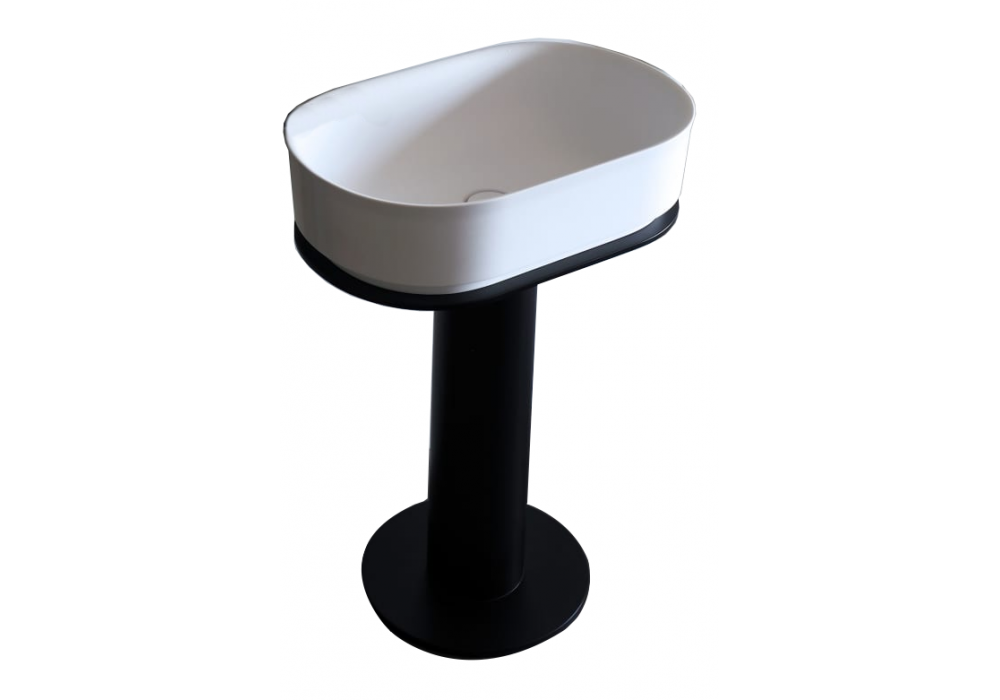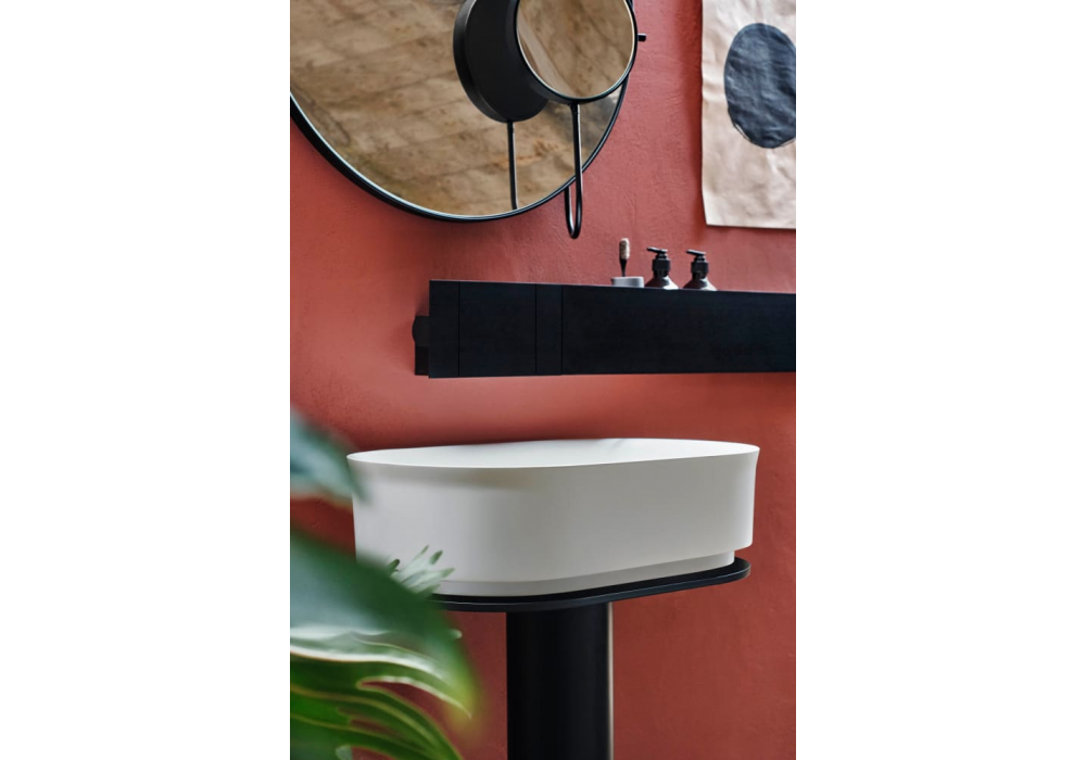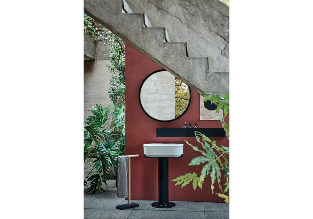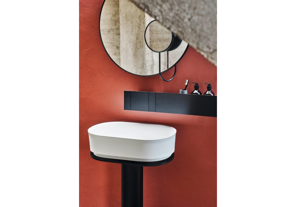 Immersion designed by Neri&Hu for Agape is a column washbasin made of Cristalplant® biobased or marble in different finishes. Metal support painted in matt black. There is no tap hole, free drain. Available in the version with wall or floor drain.