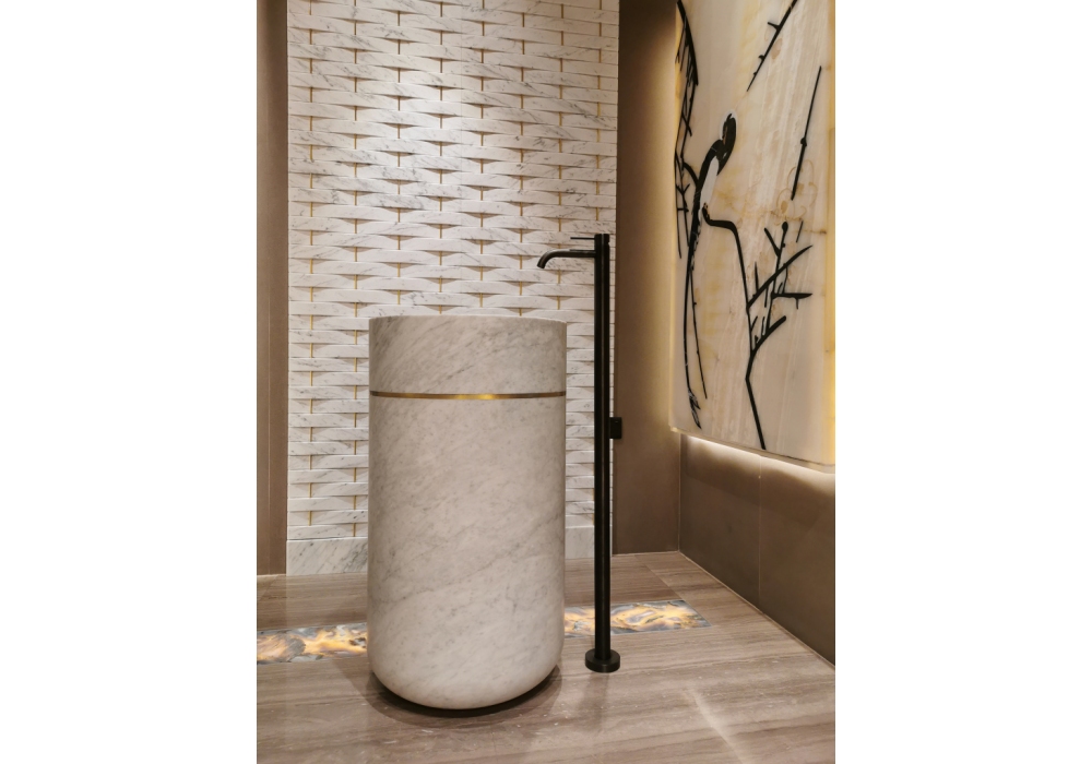 Tao designed by Marco Piva for Kreoo is a cylindrical freestanding washbasin made of marble in different finishes and vertically crossed by brass metal inserts.