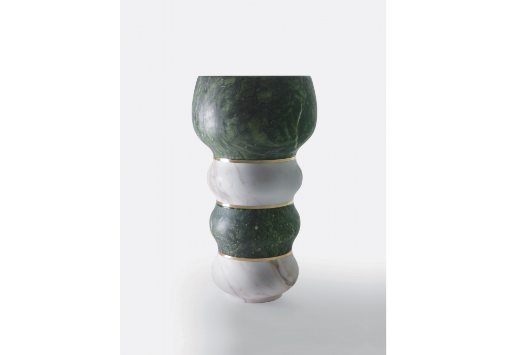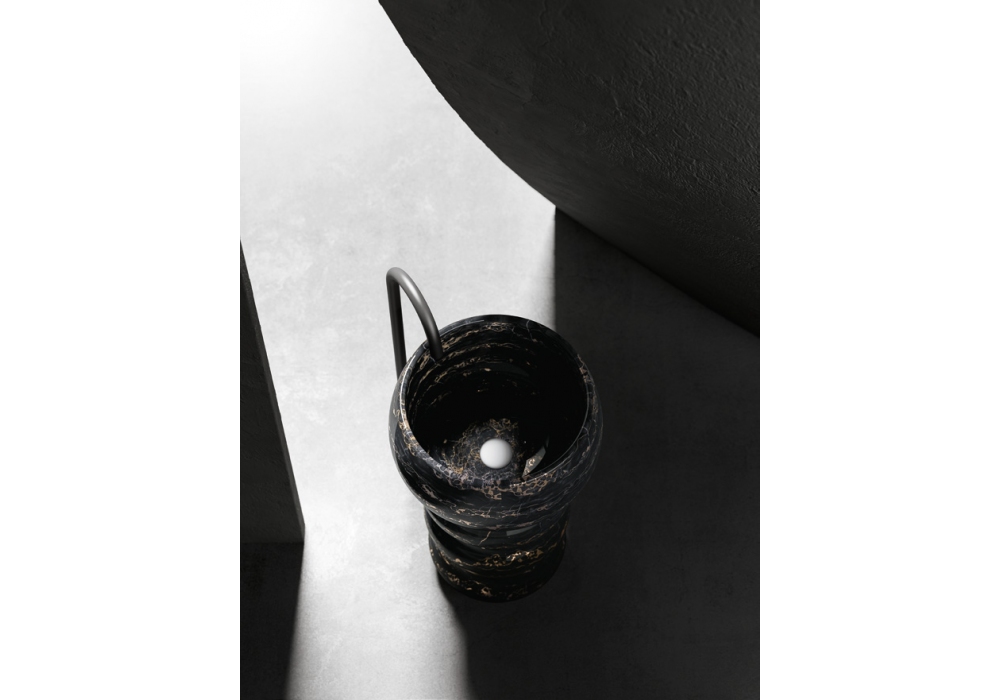 Bubbles designed by Marco Piva for Kreoo is a freestanding washbasin made up of different sections made of marble, divided by circular metal inserts in a golden brass finish. The double color combination is available on request.