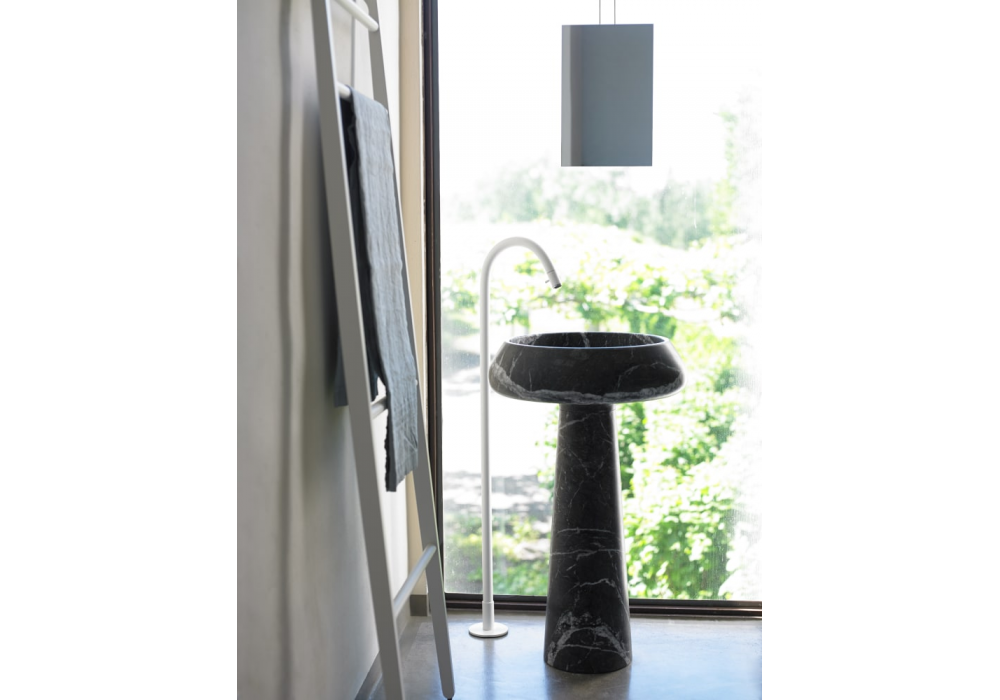 Bjhon 2 designed by Angelo Mangiarotti for Agape is a column washbasin made of marble or Cristalplant® biobased. It is characterized by a cylindrical basin and floor support. There is no tap hole; free drain. Available in the version with wall or floor drain.