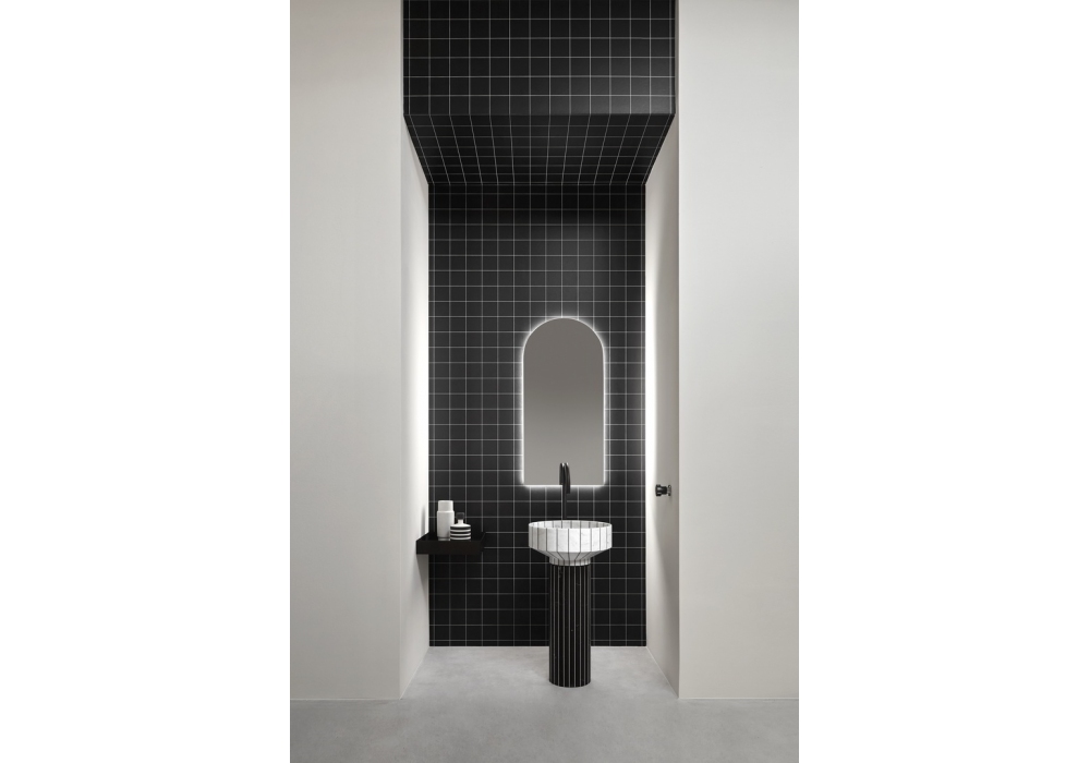 024 designed by Gumdesign for Antonio Lupi is a floor-standing washbasin composed of a Nero Marquinia marble column and a Carrara marble basin, with floor drain, complete with open drain, siphon and flexible hose.