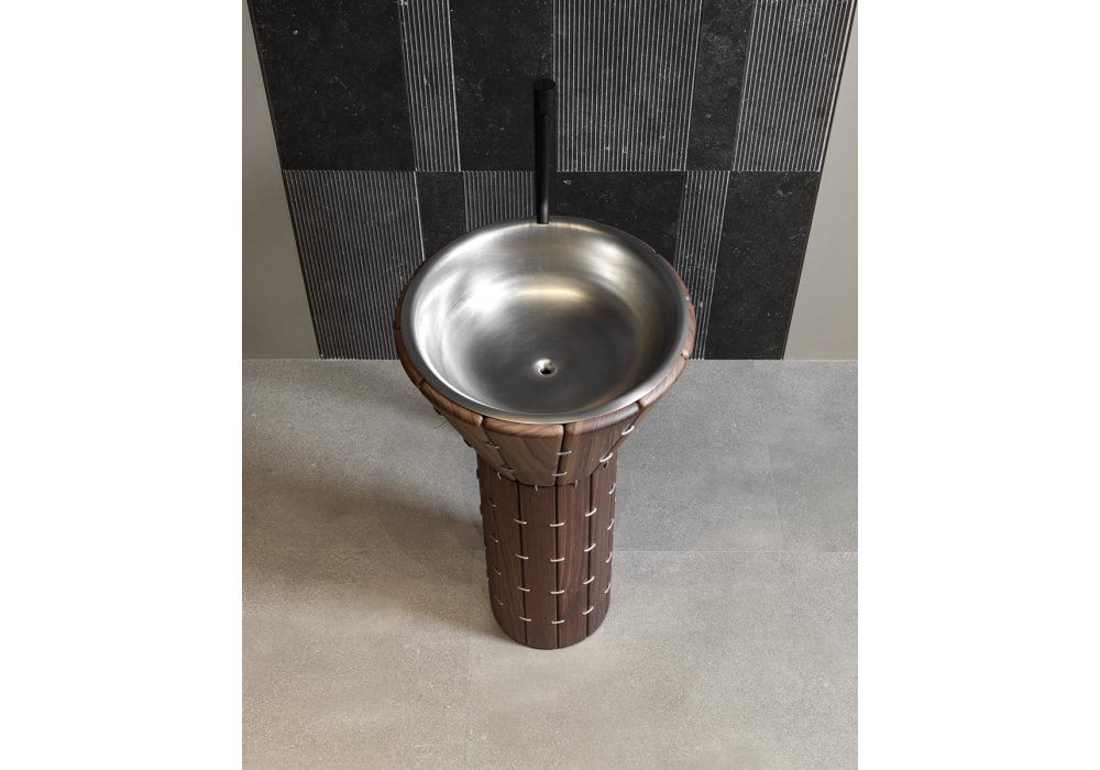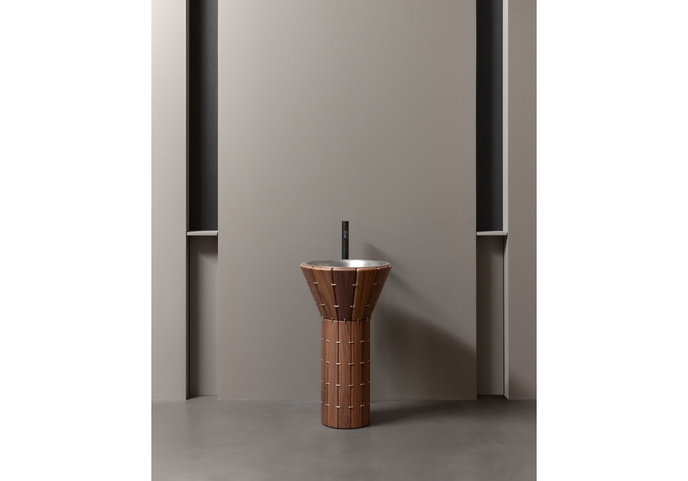 Teti & Sfera designed by AMDL Circle for Antonio Lupi is a floor-standing washbasin with a wooden slat pedestal, complete with floor drain, open-flow drain, siphon, and flexible hose. Sfera sink in AISI 316 stainless steel in various finishes.