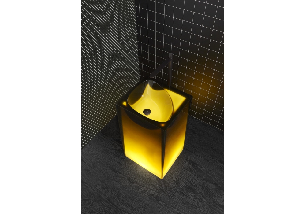Astro e Aura designed by Marco Piva for Antonio Lupi is a floor-standing washbasin in Cristalmood or Icemood with a floor drain, available with or without LED lighting. The matte body comes complete with a free-flow drain, siphon, and rigid pipe.