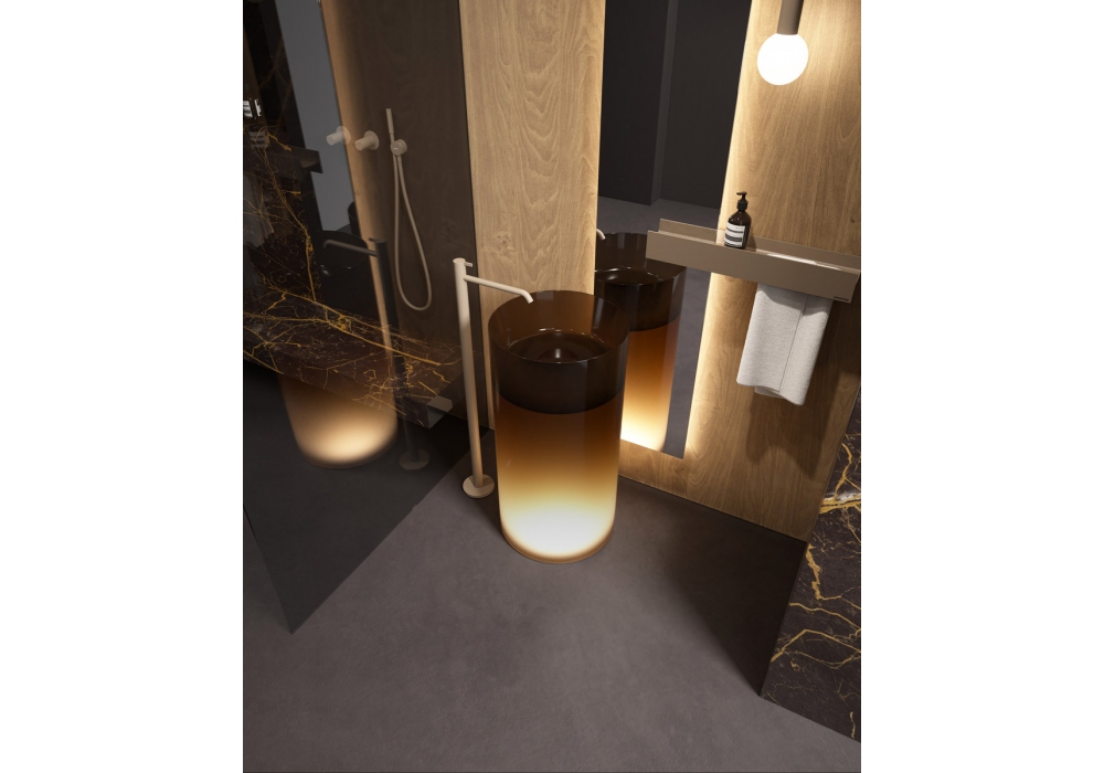 Breeze designed by Antonio Lupi is a floor-standing washbasin made of Cristalmood or Icemood with floor drain, with or without LED lighting, available in various colours, with a matte body complete with open-flow waste, siphon and rigid pipe.