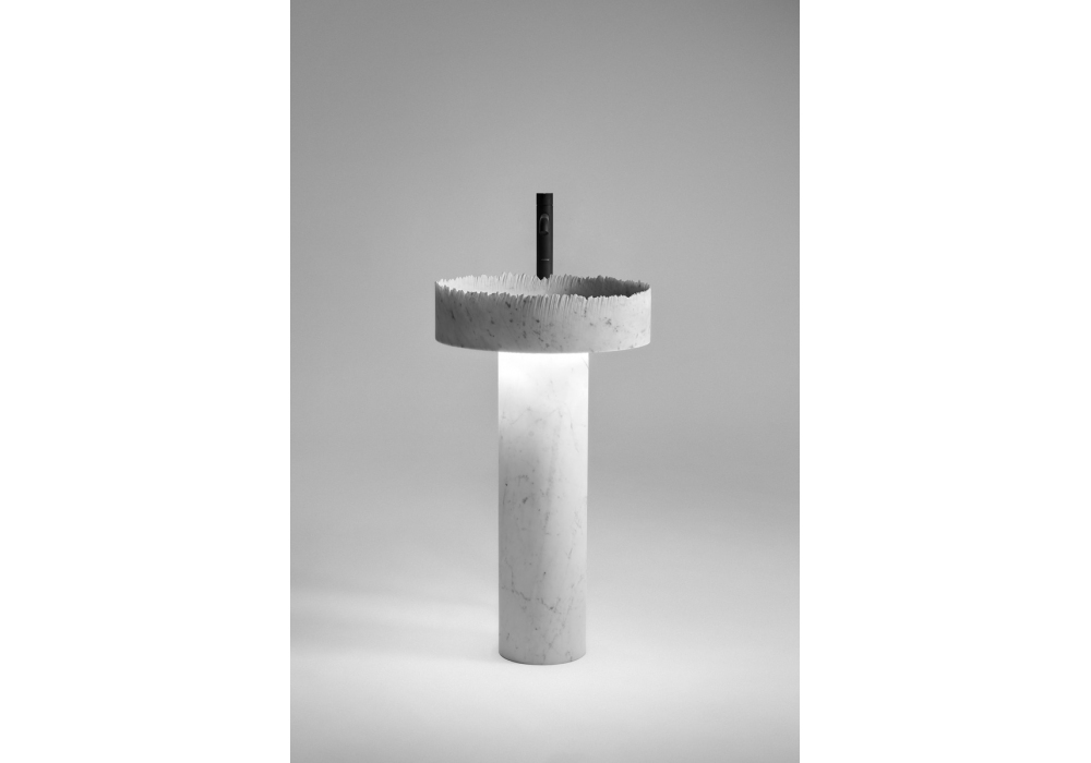 Flow designed by Paolo Ulian for Antonio Lupi is a floor-standing stone washbasin with floor drain, with or without LED lighting, complete with open drain, siphon, rigid pipe and, in the LED version, including a transformer.