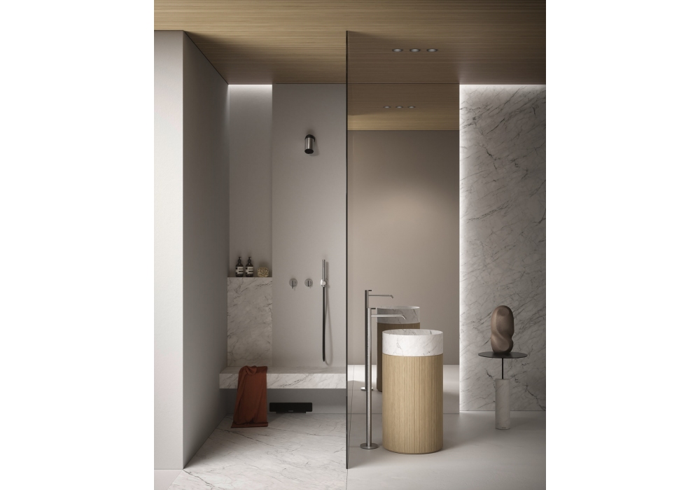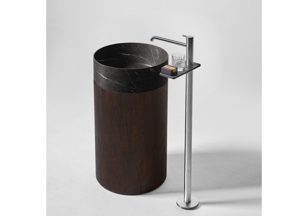 Rigatino designed by Antonio Lupi is a floor-standing washbasin with a Flumood or Colormood basin, or stone, and a wooden pedestal. It comes complete with a floor drain, open-flow drain, siphon, and flexible hose.