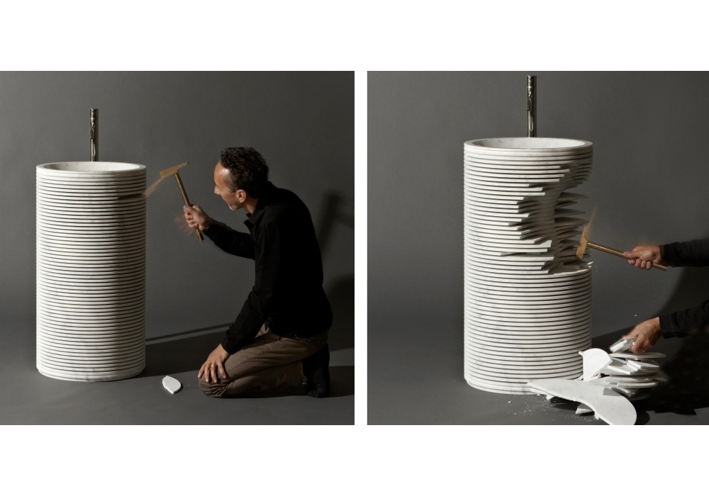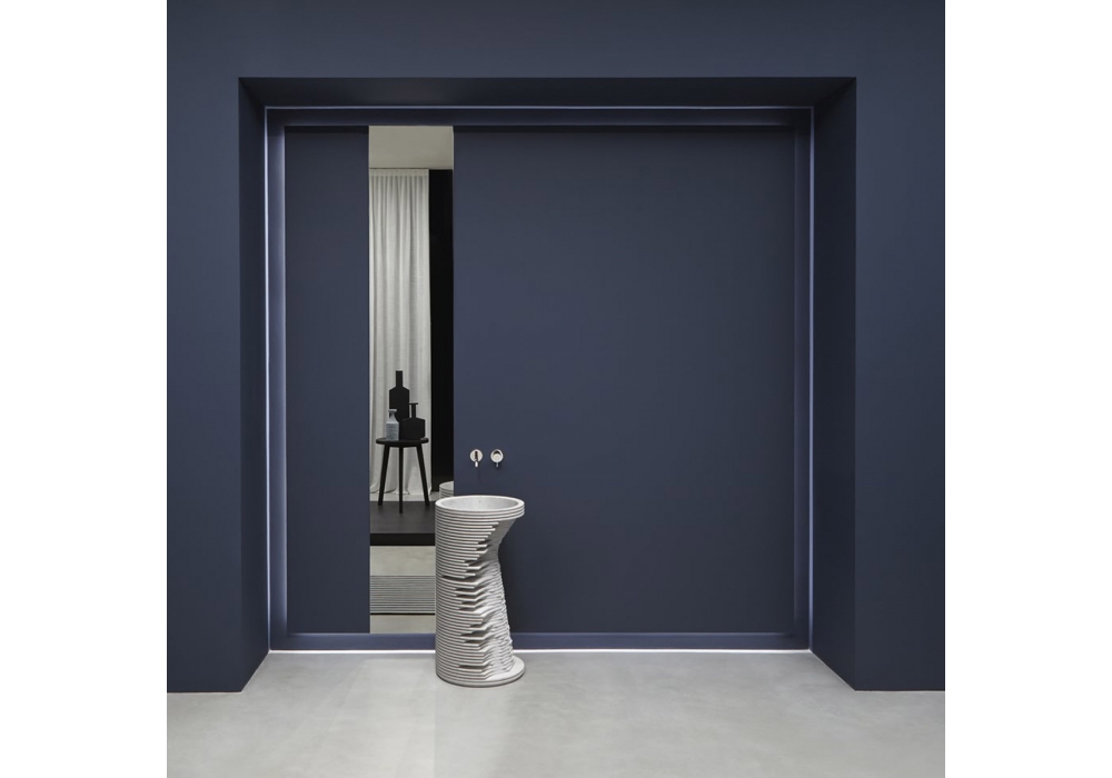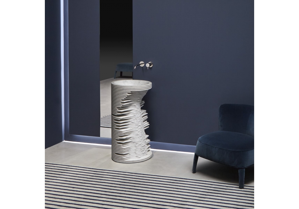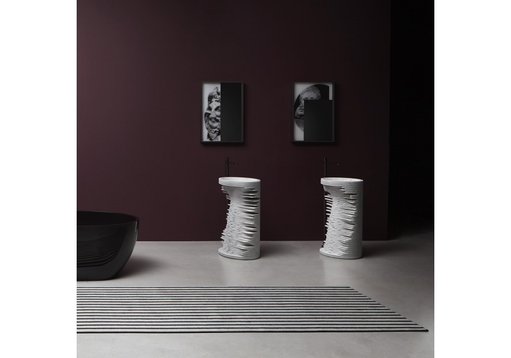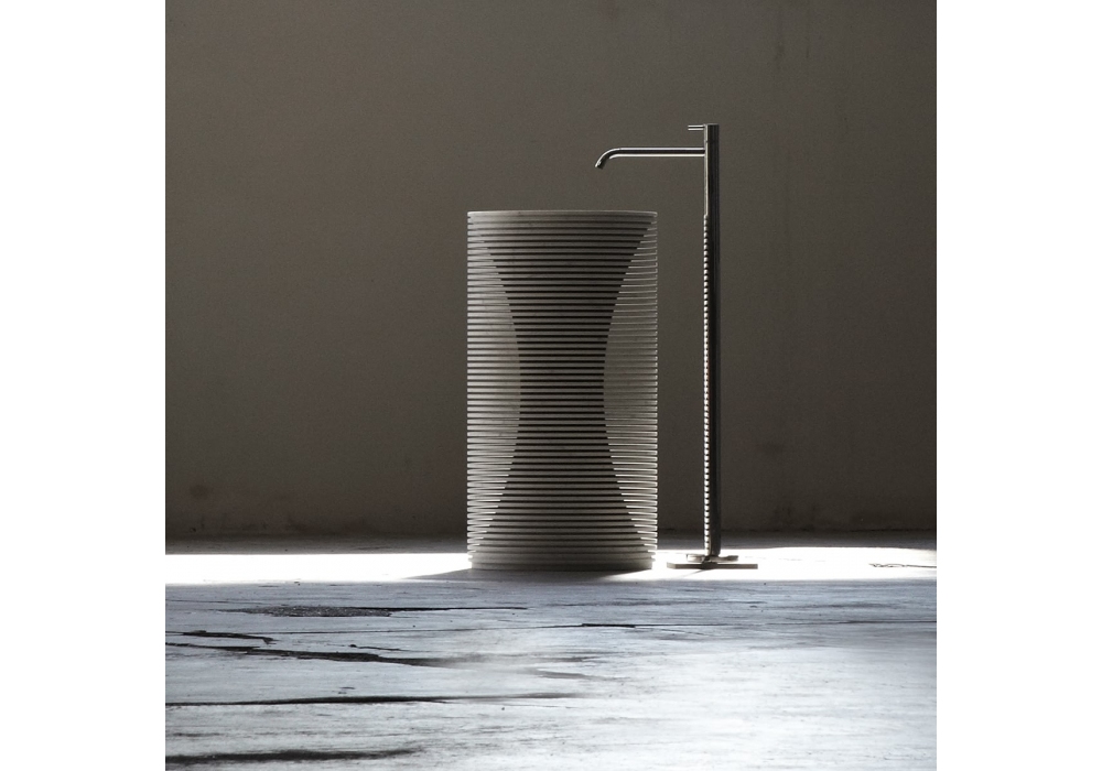 Introverso designed by Paolo Ulian for Antonio Lupi is a floor-standing stone washbasin with floor drain, complete with open drain, siphon and flexible hose.