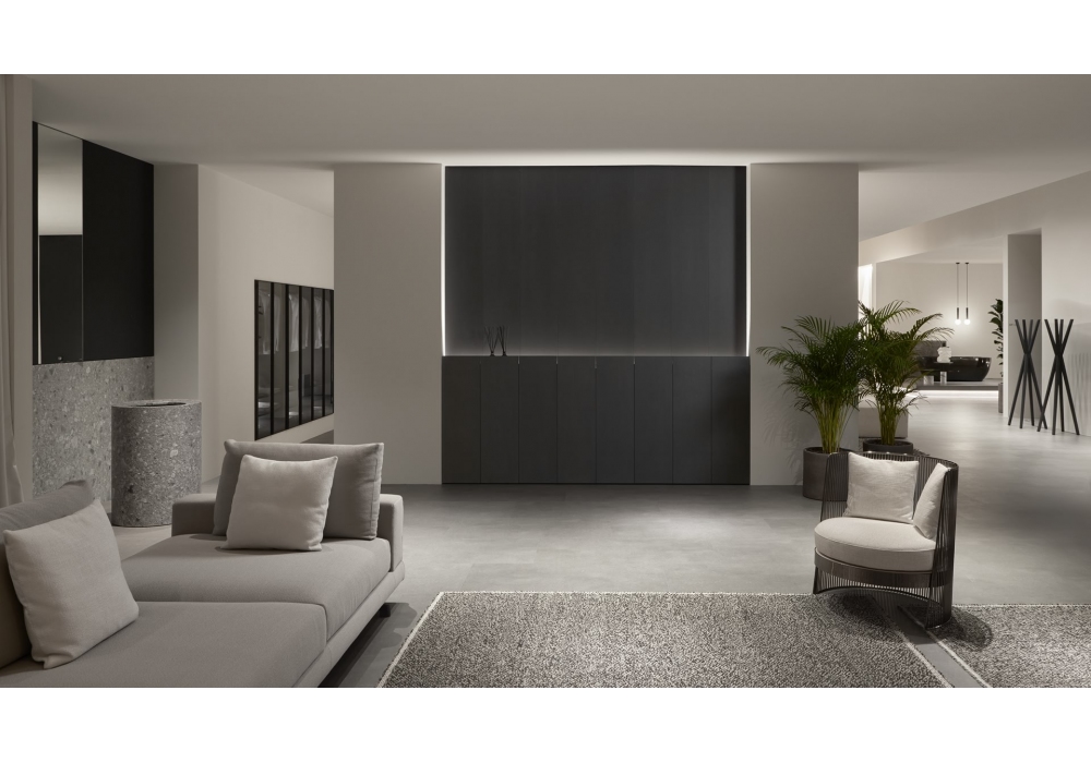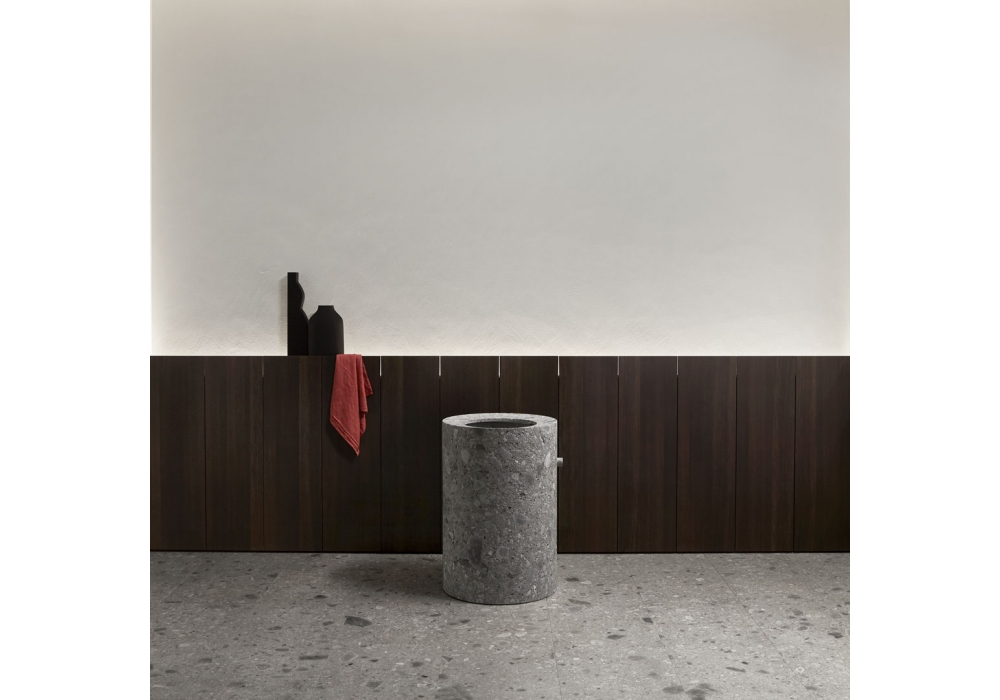 Anima liquida designed by Giorgio Rava for Antonio Lupi is a floor-standing stone washbasin with floor-level inlet and outlet, complete with hydroprogressive taps with waterfall jet, drain with open plug and flexible hose.