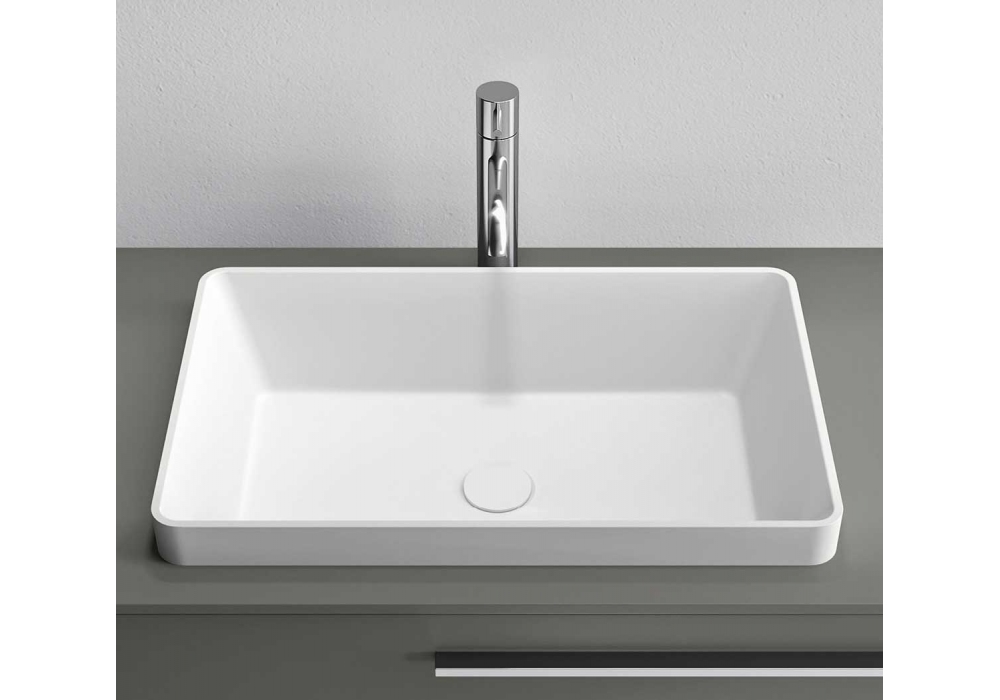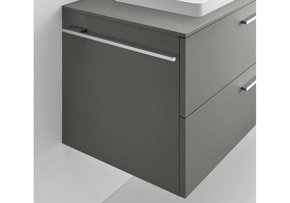One 19.02 designed by CR Noorth for Noorth is a bathroom system made with built-in washbasin, matt stone lacquered base, chrome handle, chrome finish towel rail, satin stainless steel faucet and mirror with LED lamp.