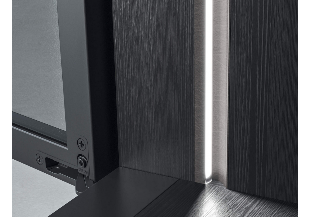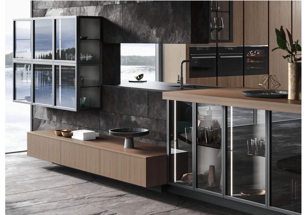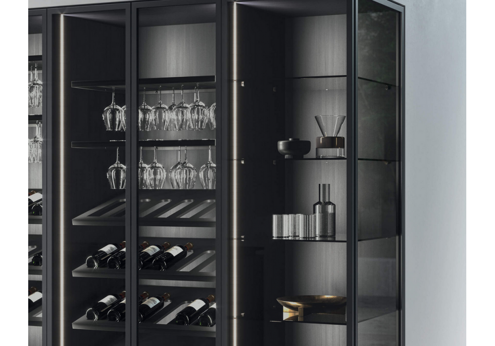 Rialto designed by Snaidero is a showcase designed to merge the kitchen area with the living room, the doors are in smoked glass while the frame can be customized in different materials. The internal lighting system of the showcases with vertical light cut flush with the side of the cabinet prevents glare and at the same time highlights the internal fittings.