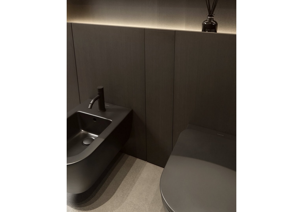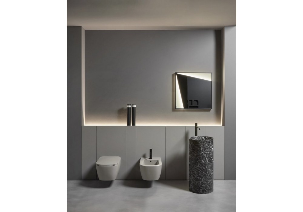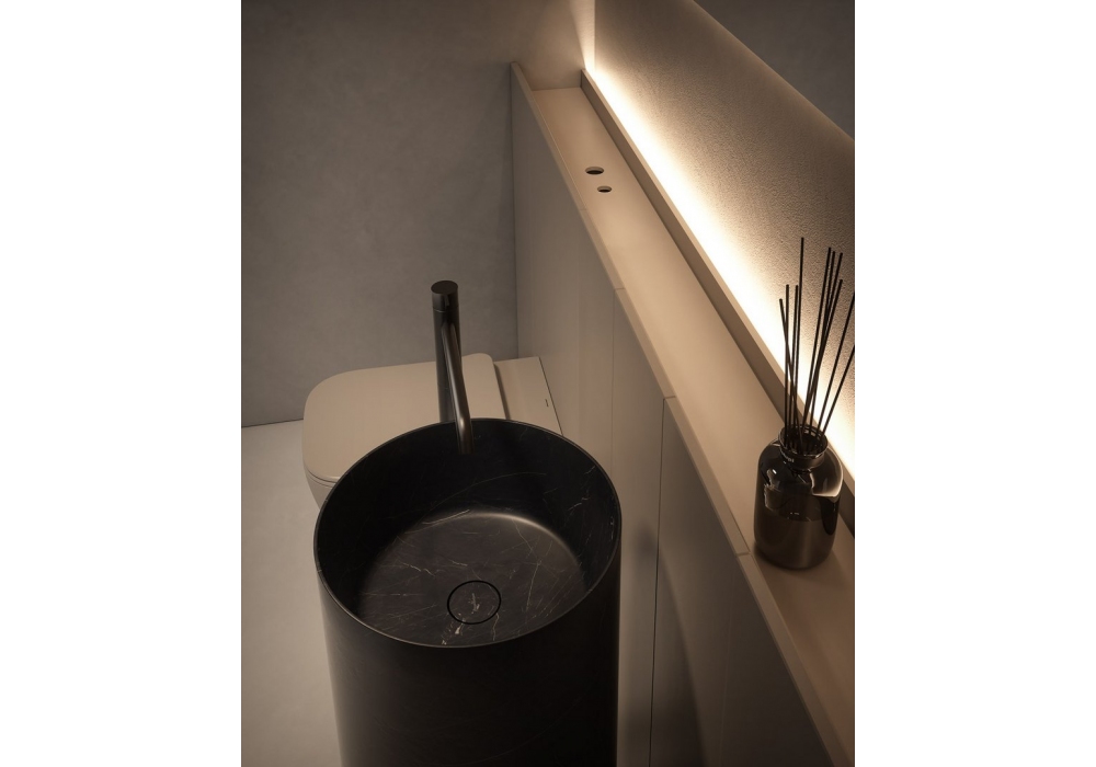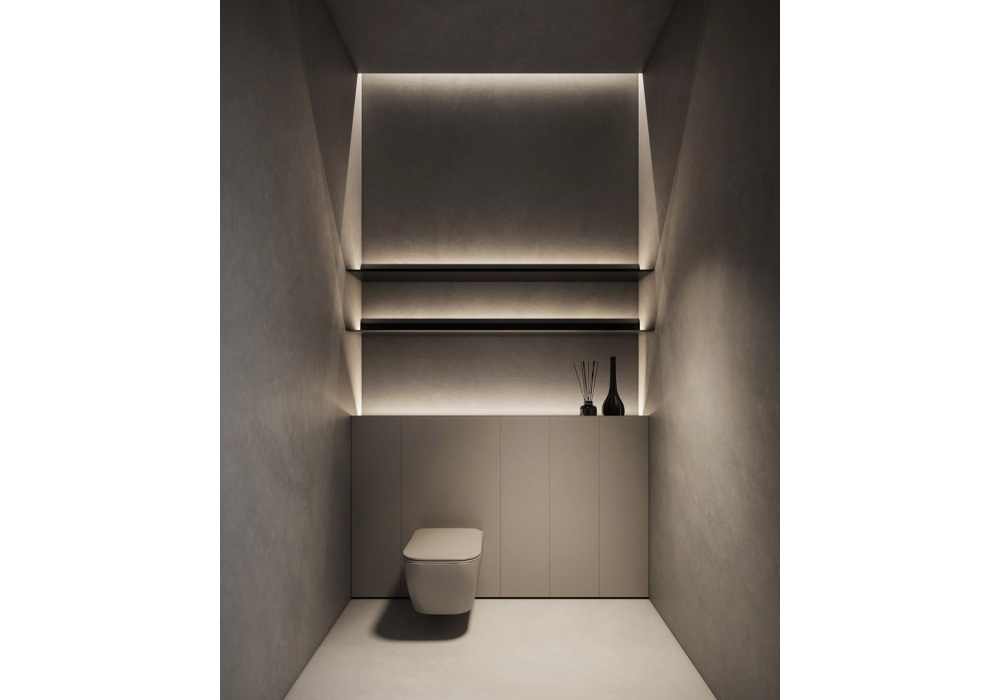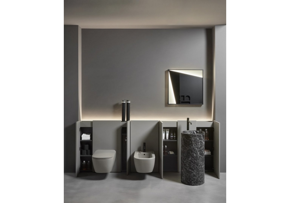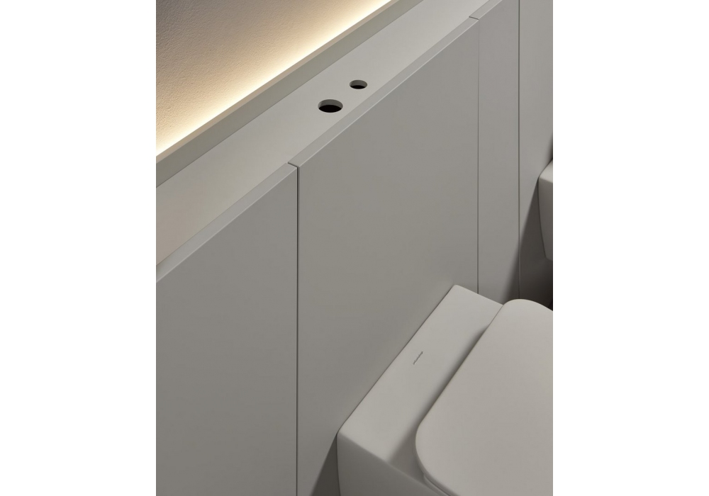 Al_Offset designed by Simone Savini for Antonio Lupi is a wall-mounted storage system that combines functionality and aesthetics. A continuous paneling seamlessly integrates fixtures and volumes, concealing spacious compartments and a practical storage channel. Thanks to customizable finishes, materials, and colors, it transforms a technical element into an elegant and harmonious highlight of the bathroom space.