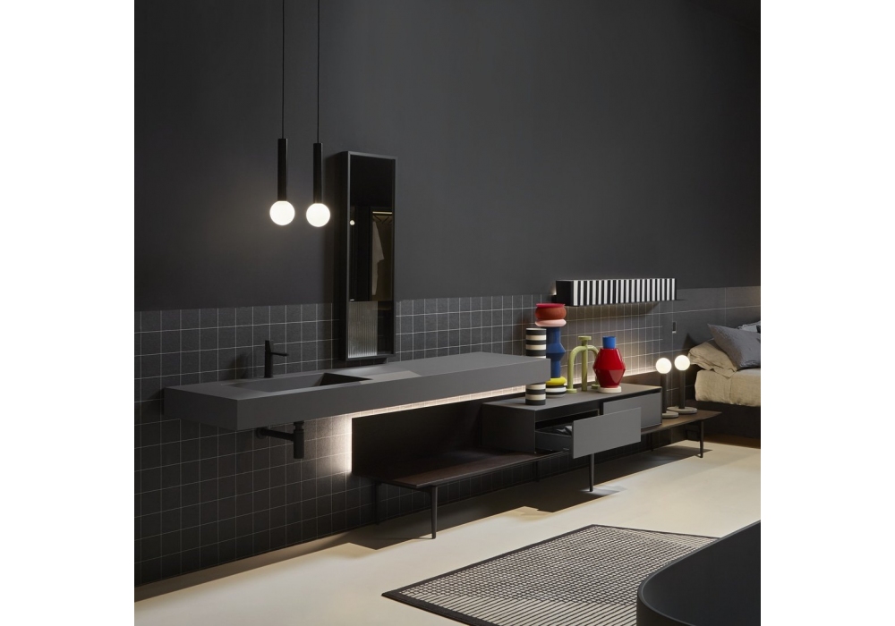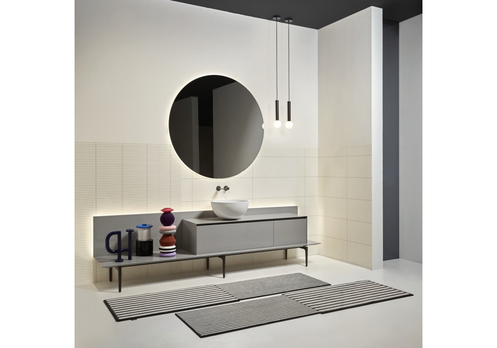 Ala designed by Carlo Colombo for Antonio Lupi is a simple and versatile system that begins with a simple L-shaped shelf and transforms into a compositional element for the bathroom and living area. Available in lacquered or wood veneer, wall-mounted or floor-standing, with or without backlighting, Ala can be used as a support for sinks, containers, and accessories, or as a console for audio/video equipment. A continuous, linear surface that allows for maximum compositional freedom between functionality and aesthetics.
