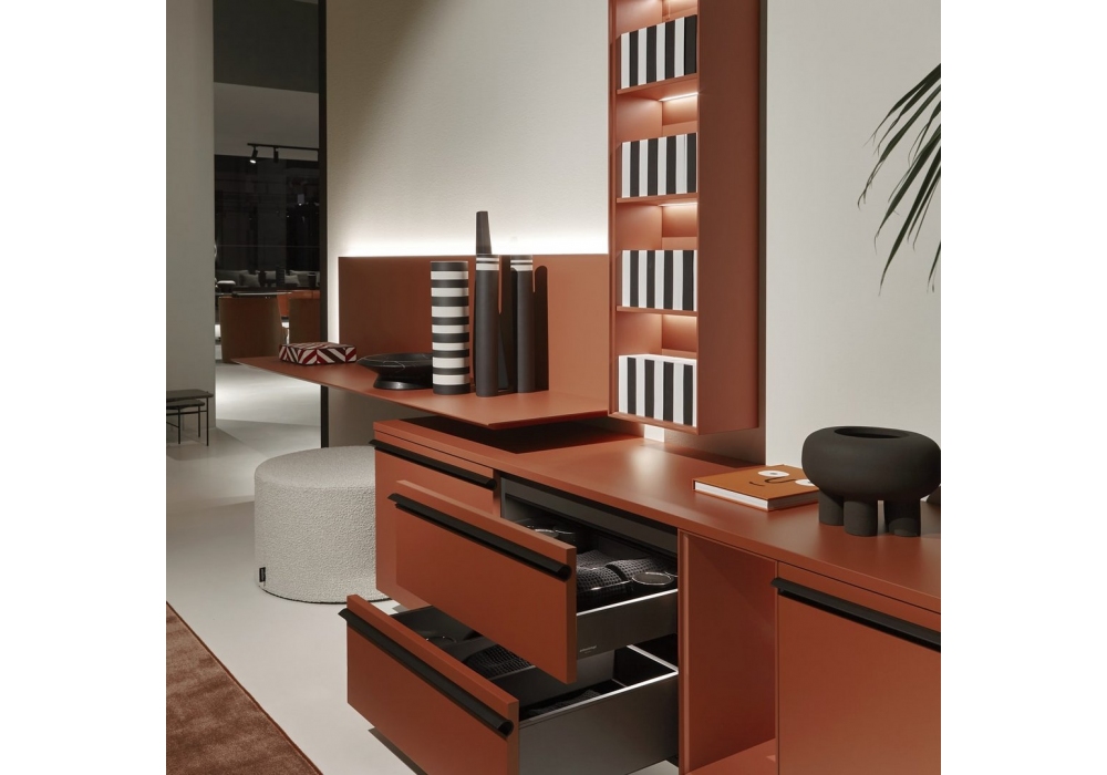 Ala_Living designed by Carlo Colombo for Antonio Lupi is a simple and versatile system that begins with a simple L-shaped shelf and transforms into a compositional element for the bathroom and living area. Available in lacquered or wood veneer, wall-mounted or floor-standing, with or without backlighting, Ala can be used as a support for sinks, containers, and accessories, or as a console for audio/video equipment. A continuous, linear surface that allows for maximum compositional freedom between functionality and aesthetics.