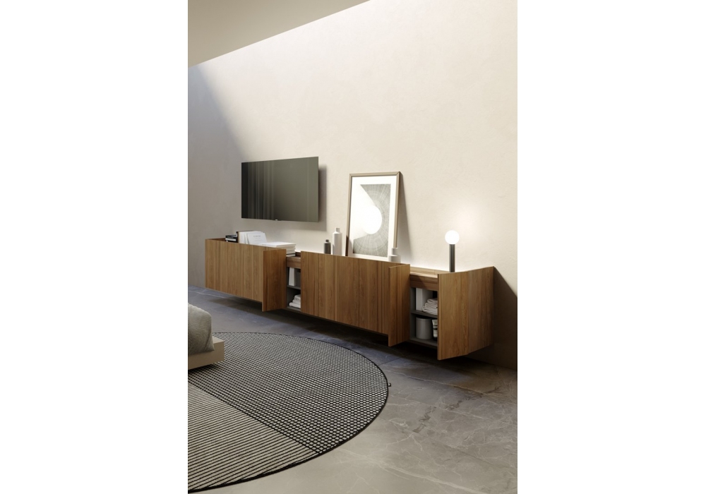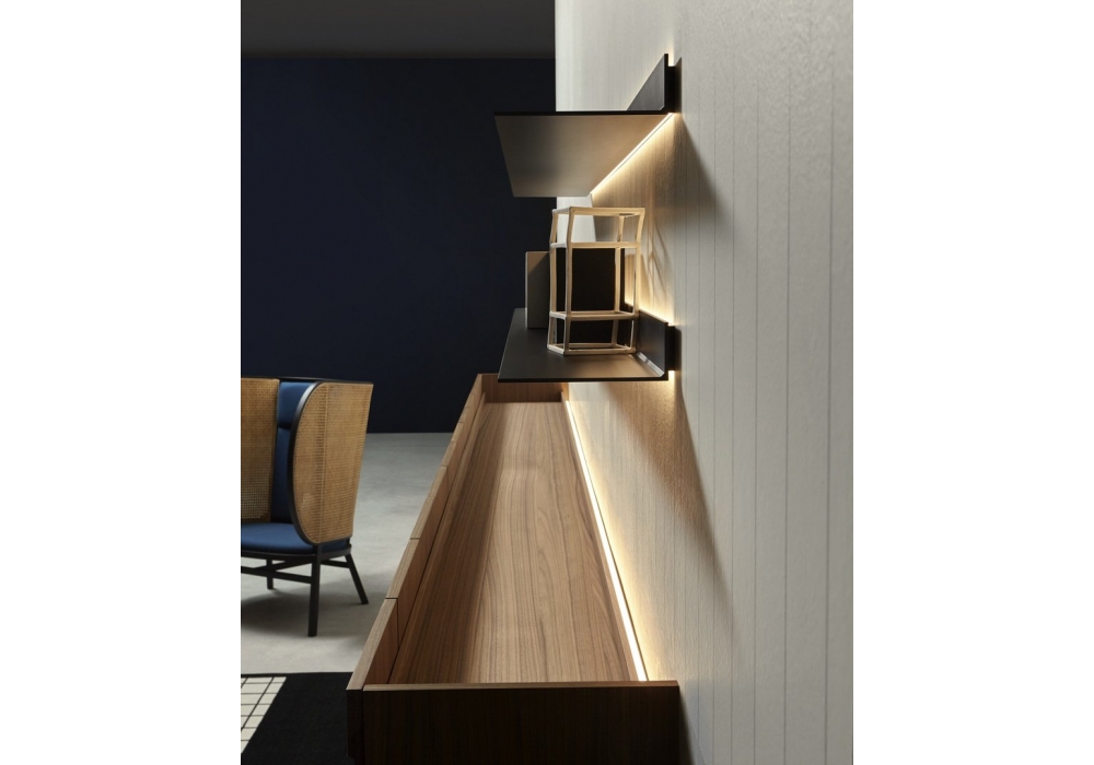 Anima Liquida designed by Giorgio Rava for Antonio Lupi is a system of modular paneling and storage units that combines elegance and functionality. Wooden or lacquered surfaces, interrupted by thin vertical slits, create a continuous, refined front that conceals LED-lit countertops and shelves. Available in floor-standing or wall-mounted versions, in various sizes and finishes, Anima Liquida adapts to bathrooms, living rooms, and other areas of the home, establishing a harmonious dialogue with the materials and textures of the space.