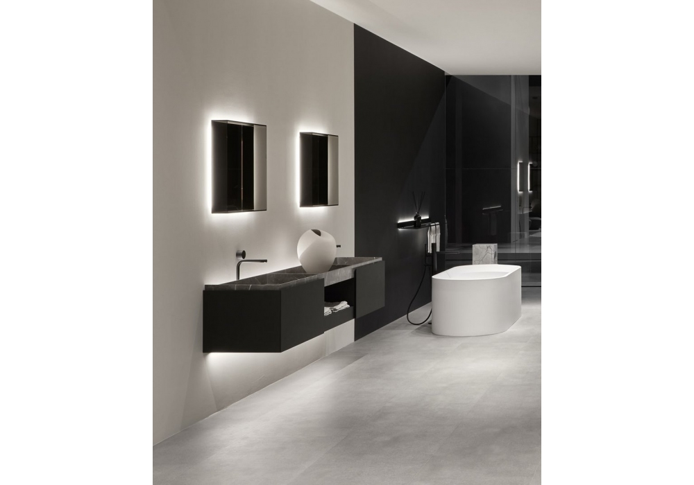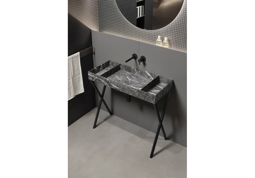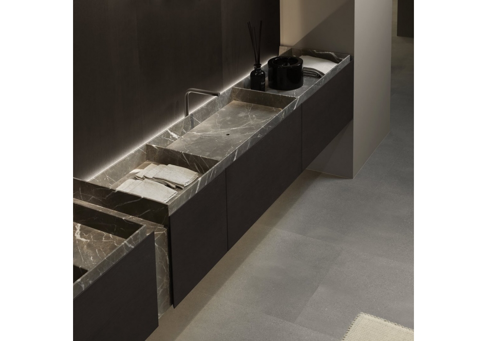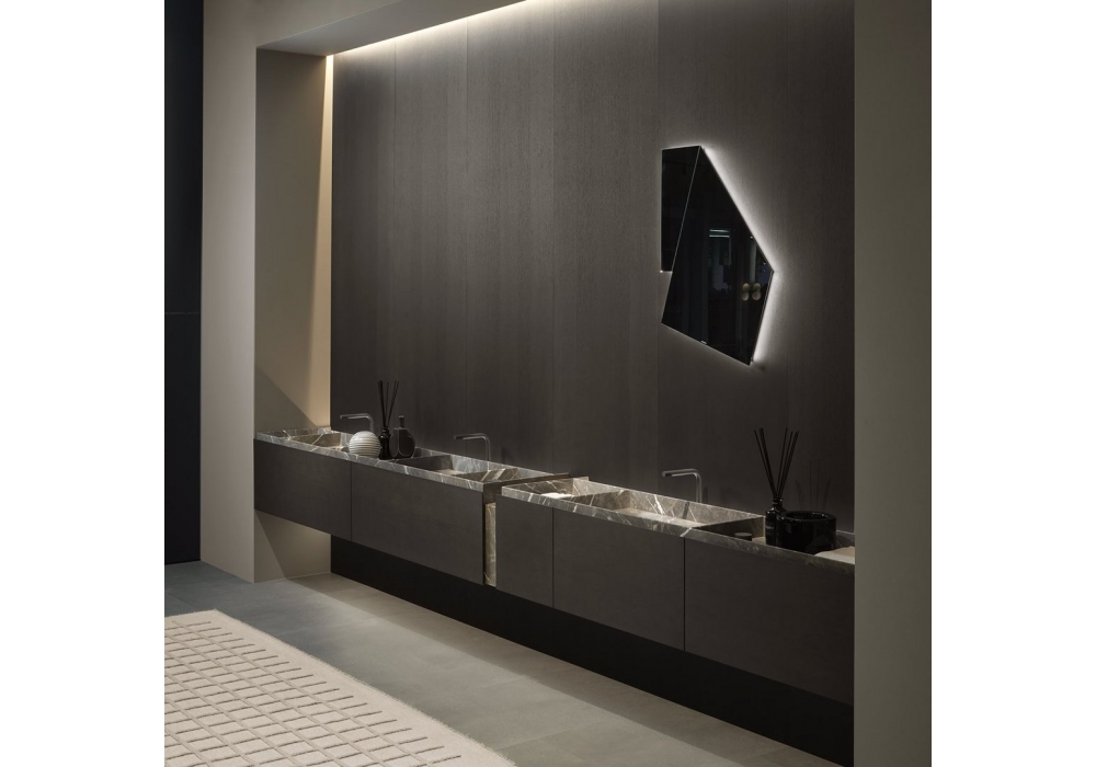 Nabatei designed by Antonio Lupi is a system of marble sinks and cabinets that combines simplicity, elegance, and functionality. They are distinguished by clean geometric lines and thin thicknesses that enhance the uniqueness of the stone. Each sink can accommodate faucets, accessories, or primary basin functions, while wall-mounted or floor-standing cabinets complete light and harmonious compositions. The collection includes cubic, freestanding, and countertop sinks in Cristalmood or marble, offering modular solutions and customizable configurations for every project.