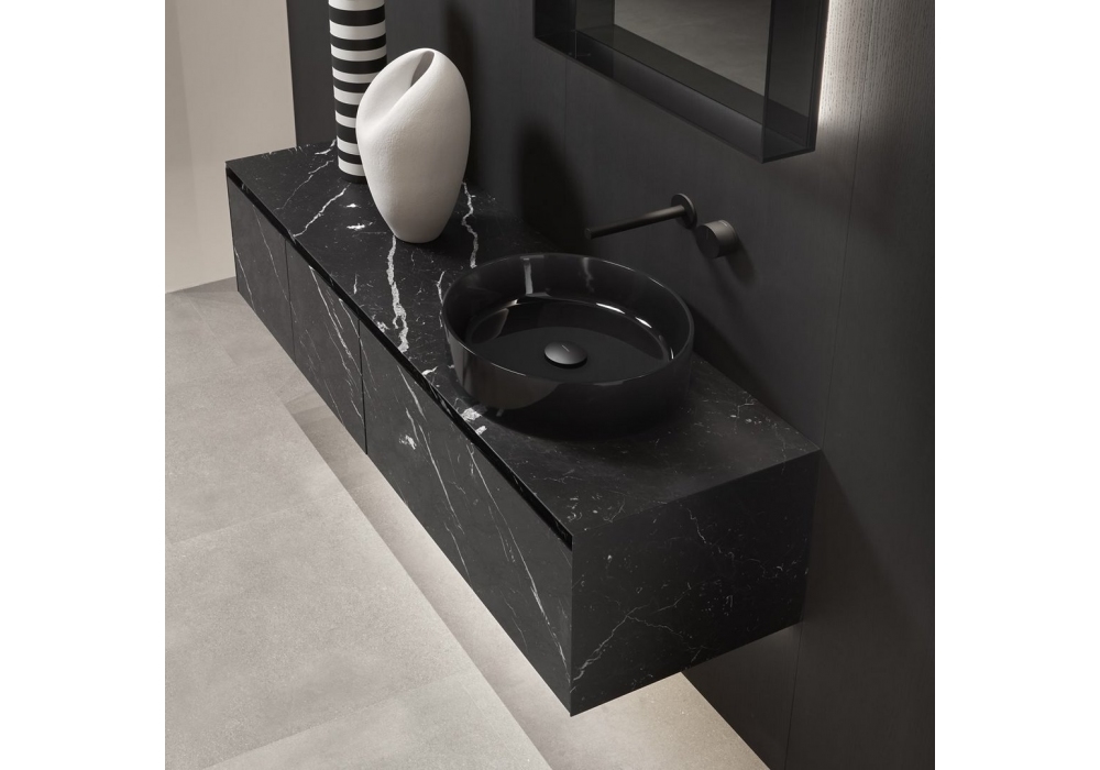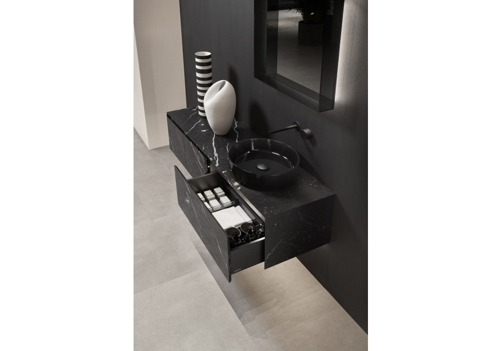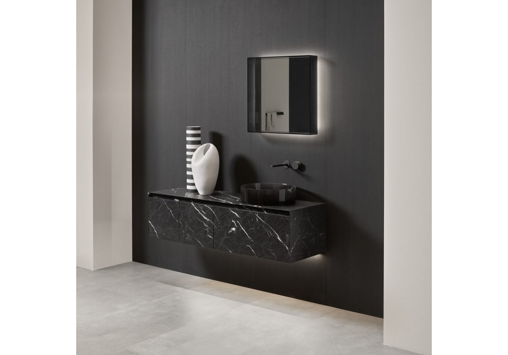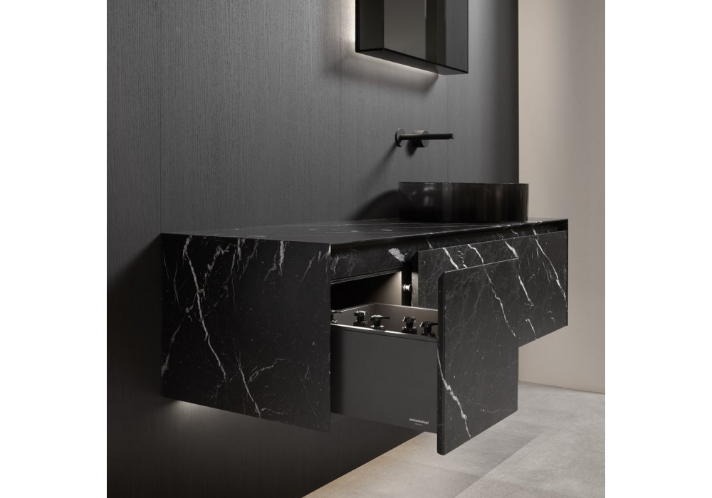 Panta Rei_Stone designed by Carlo Colombo for Antonio Lupi is a system made entirely of marble, an expression of sculptural elegance and sartorial craftsmanship. Each element is crafted from a single block of natural stone, precision-crafted to enhance the unique veining and nuances of the marbles in the antoniolupi collection. The distinctive 45° cut of the profiles lends visual lightness and material continuity, while the perfect fusion of technology and material makes Panta Rei_Stone a symbol of balance between design, innovation, and nature.