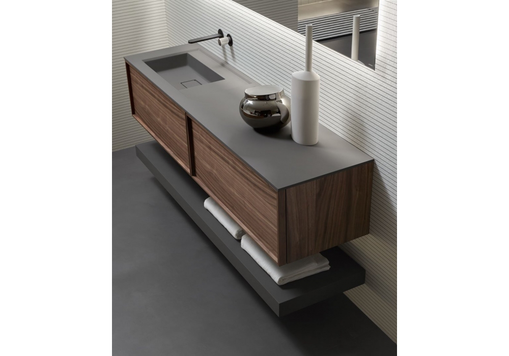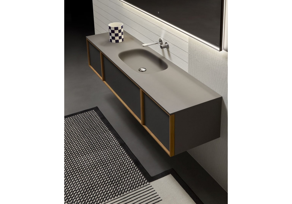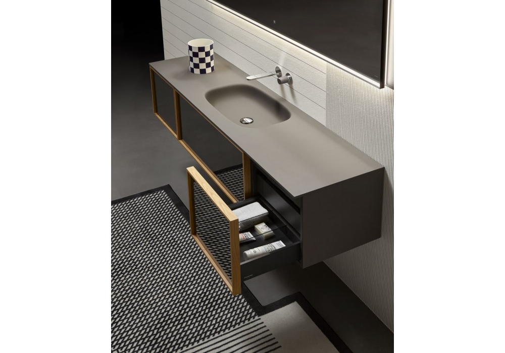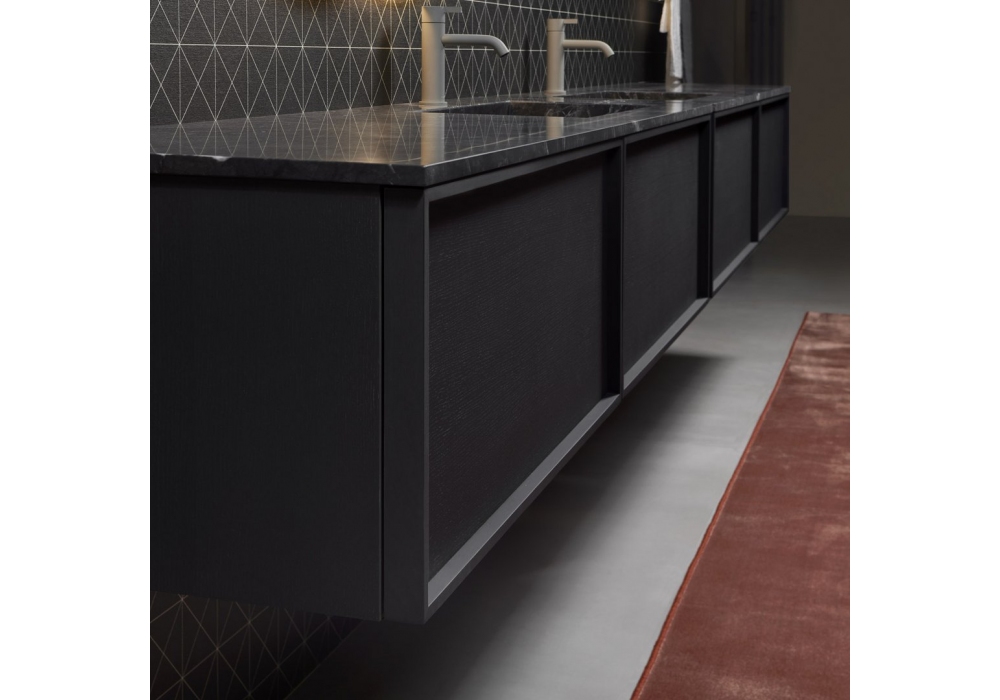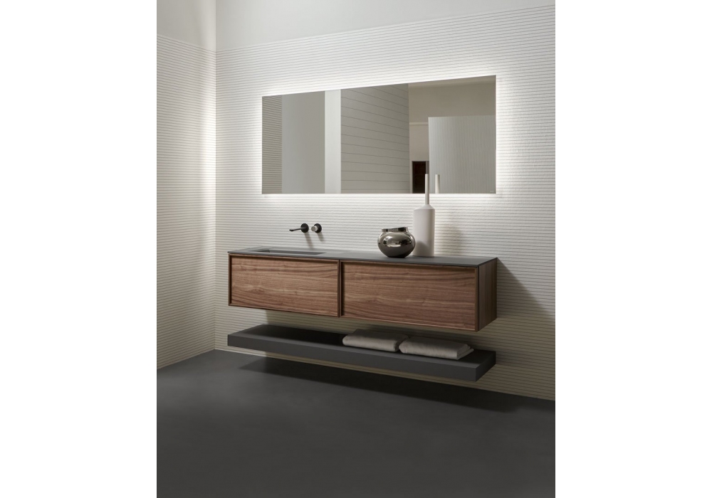 Riquadro designed by Antonio Lupi is a system with a minimalist, contemporary design, defined by pure geometries and perfectly proportioned volumes. The embossed frame, a distinctive element of the project, encloses and enhances the wooden, lacquered, or silvered glass surfaces, creating a refined interplay of materials, colors, and reflections. Lightness, elegance, and formal precision come together to create a collection capable of interacting with diverse stylistic contexts, blending functionality and aesthetics in perfect harmony.