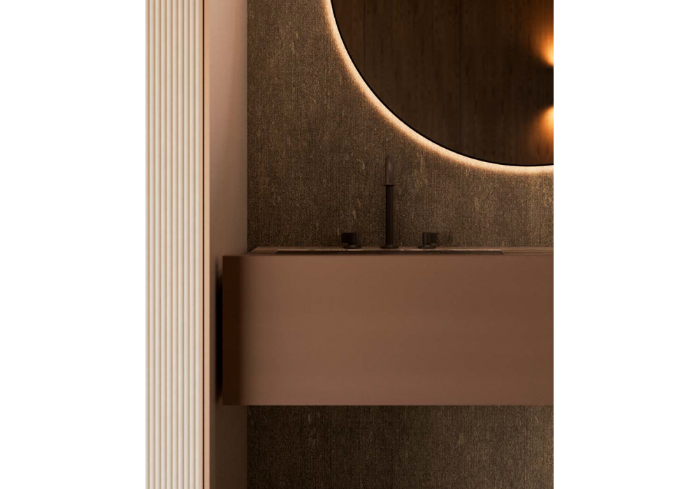 Framis designed by Vincent Van Duysen for Molteni&C is a contemporary bathroom system in which the Framis sink area integrates with the Gliss Master wardrobe system, creating a complete and functional walk-in closet. The suspended base unit in matte cappuccino lacquer is paired with a Titan travertine countertop with an integrated sink, while the round backlit mirror adds balance and sophistication to the space. Flora faucets and refined finishes complete the composition, ideal for suites, hotels, and prestigious residences.