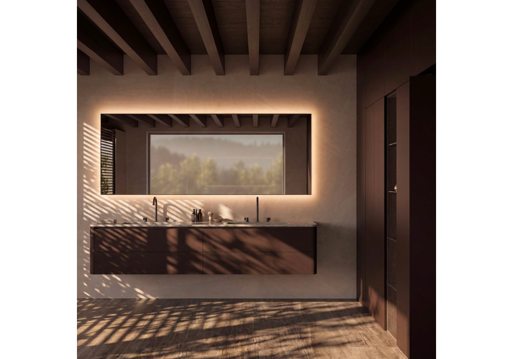 Hi-Line 6 designed by Molteni&C is a bathroom system with drawer bases in matt copper lacquer, completed by a Super White marble top with integrated double sinks. The curved end panel and beveled top create a fluid, refined line. The rectangular backlit mirror, seamlessly integrated with the base, enhances the visual balance. To the side, floor-standing columns and Arial paneling in copper lacquer complement an open coffee oak cabinet, adding textural contrast and functionality. Flora mixer taps complete the look.