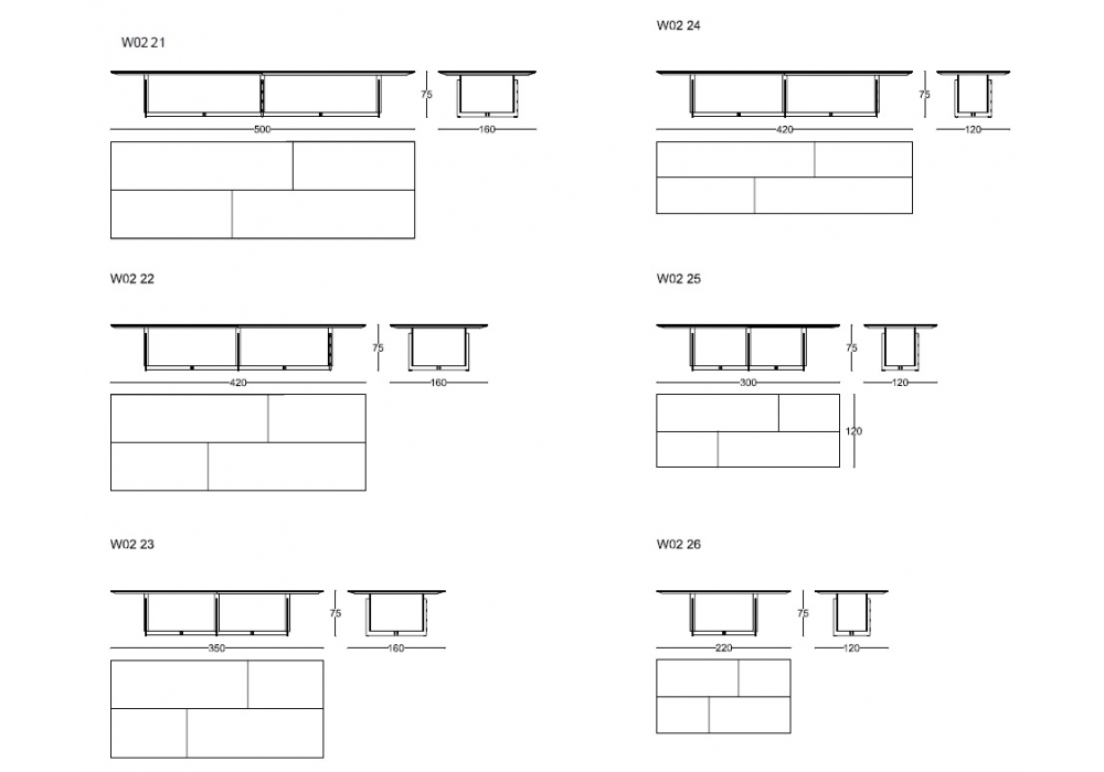 | Top | 500 x 160 cm; 420 x 160 cm; 350 x 160 cm; 420 x 120 cm; 300 x 120 cm; 220 x 120 cm. |