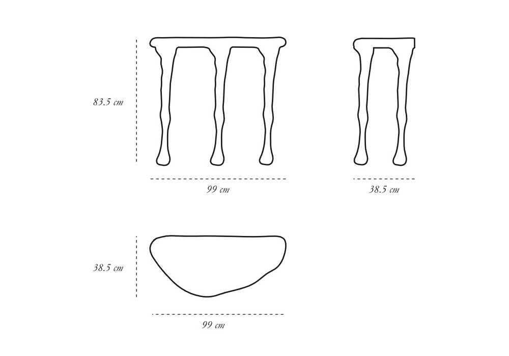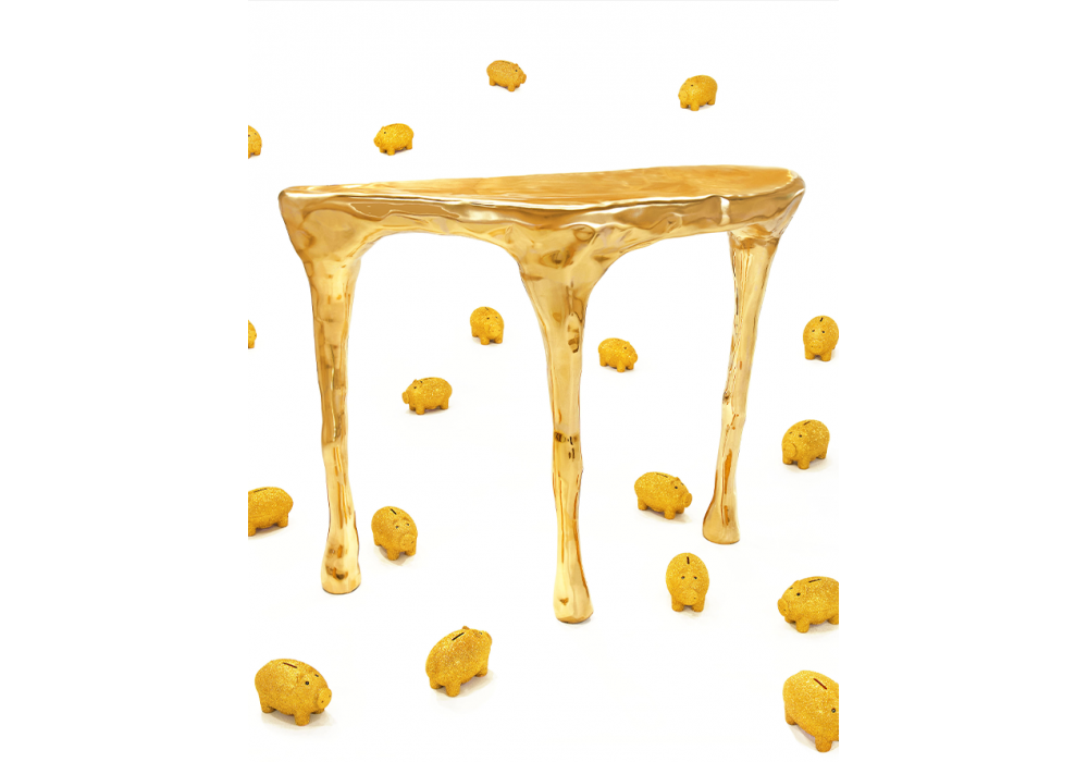 Bliss produced by Scarlet Splendor is a three-legged console made of glossy lacquered brass with an organic shape and a wavy surface.