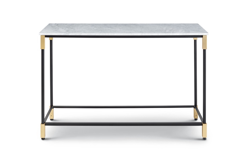 Match designed by Bernhardt & Vella for Arflex is a console with a matt black lacquered metal structure and brass joints. Marble or travertine top.