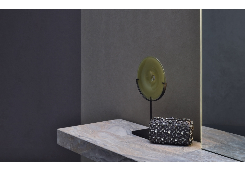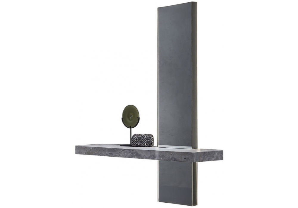 Peak designed by Pinuccio Borgonovo for Natevo is a console with mirror. It can be used as a shelf but more importantly as a light source thanks to the Led light fittings that discretely illuminate the ceiling and the floor. The top in glass or marble gives the console a highly contemporary look.
