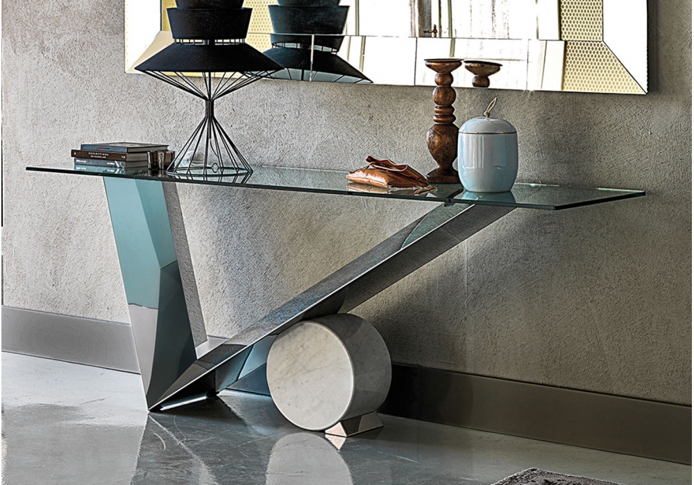 Valentinox designed by Emanuele Zenere for Cattelan Italia is a console with steel base and cylinder in marble. Top (laid on the base) in 12mm glass. Available in 4 different dimensions. Manual processing may cause reflection irregularities on the base.