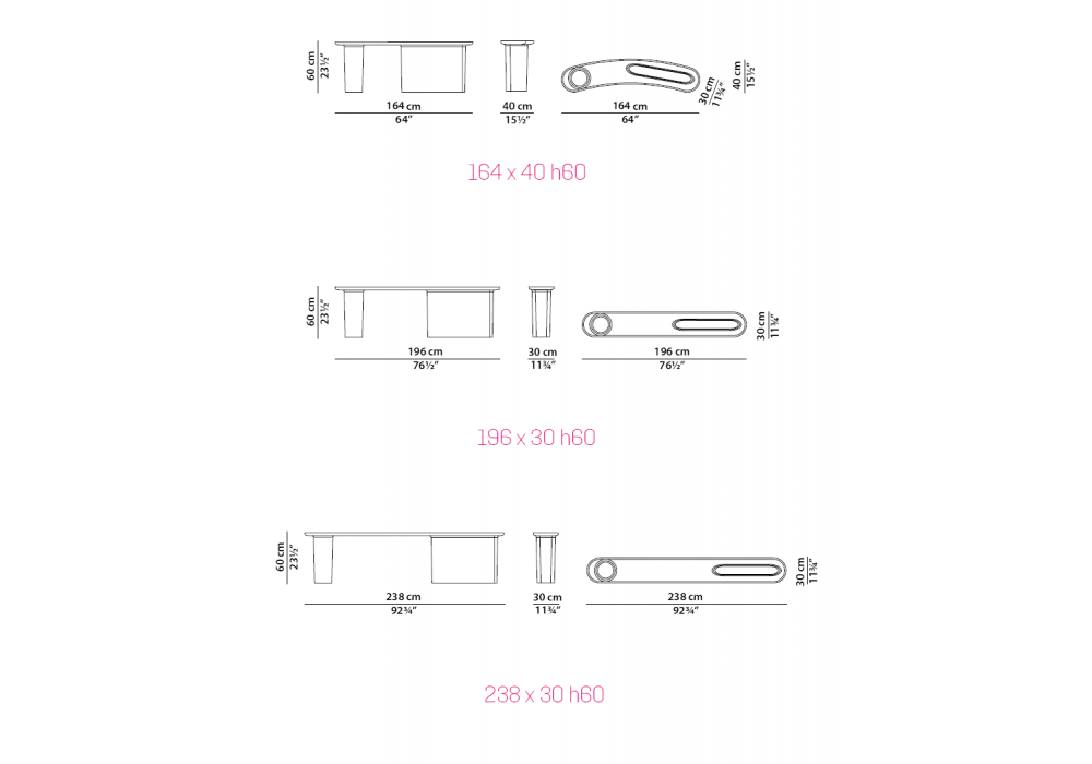 | Dimensions | Ø 50 x H 50 cm; Ø 75 x H 42 cm; Ø 110 x H 32 cm; 184 x 84 x H 24 cm. |