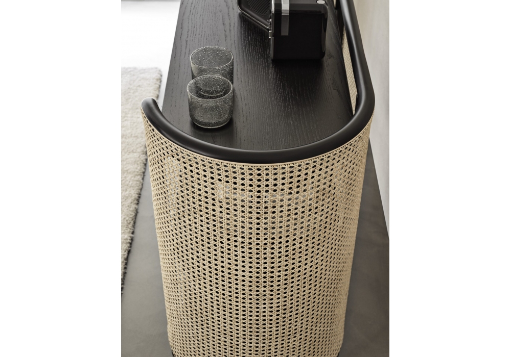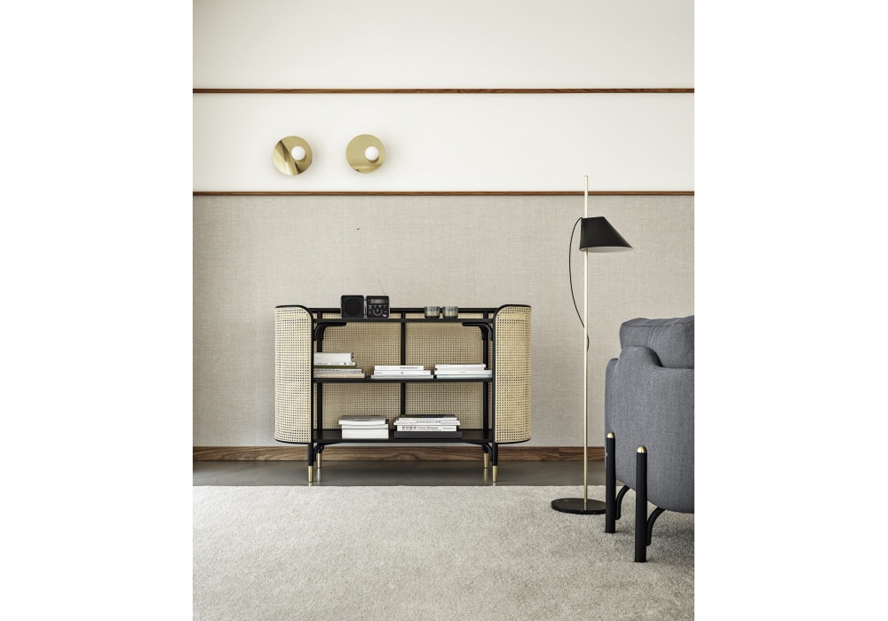 Mos designed by GamFratesi for Gebrüder Thonet Vienna is a console with bent beech-wood frame and woven cane inserts. Open pore painted shelves in ash veneer. Brass feet.